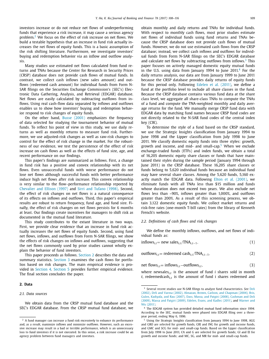 这项研究有助于现存文献在两个方面。首先,我们提供了明确的证据,证明基金风险的增加会增加股票基金的净流量。其次,使用N-SAR文件中的基金净流量、资金流入和资金流出,我们显示了风险变化对资金流入和流出的影响,表明先前研究中常用的资金净流量不能完全解释基金投资者的行为。
