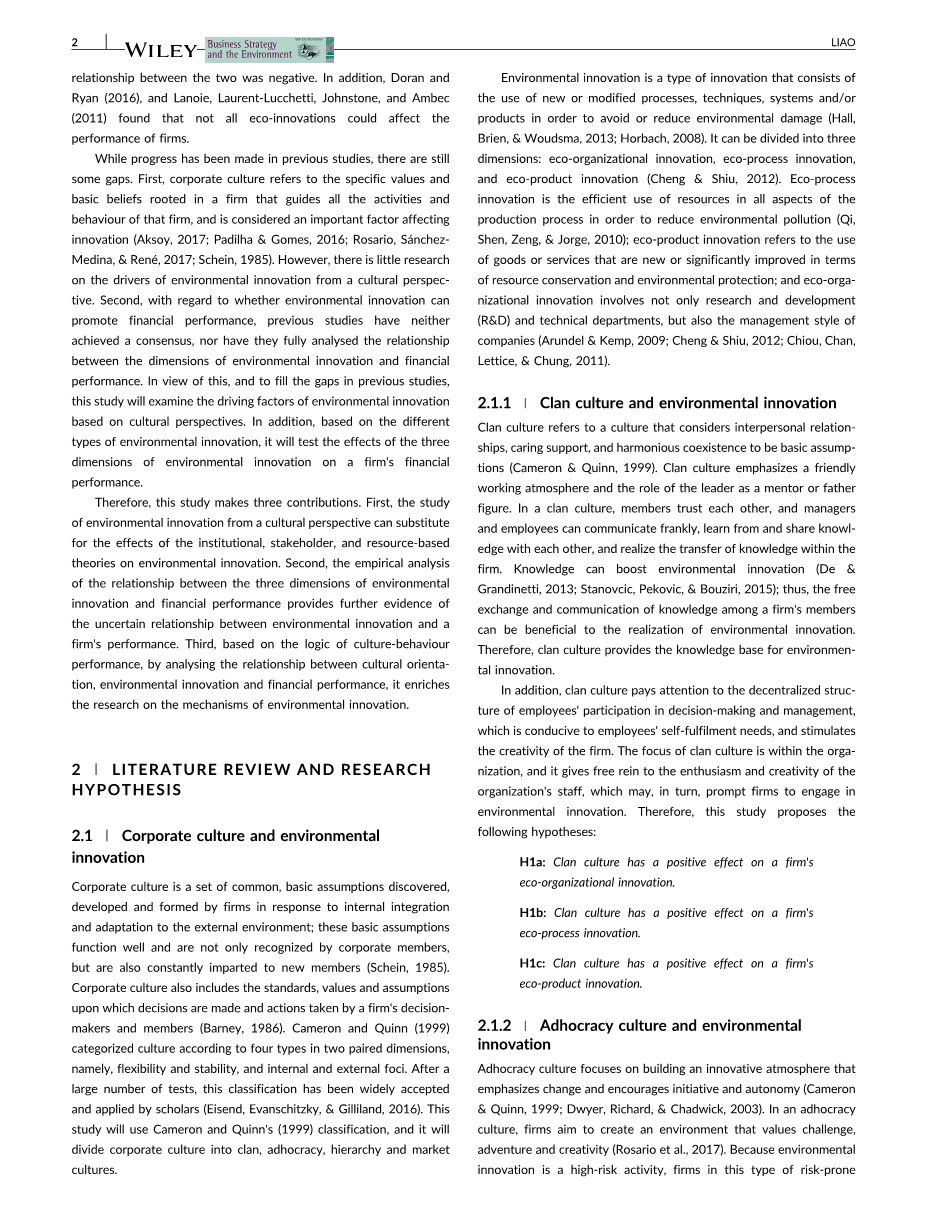 虽然在以前的研究中取得了进展,但仍然存在一些差距。首先,企业文化是指植根于指导企业所有活动和行为的企业的具体价值观和基本信念,被认为是影响创新的重要因素(Aksoy,2017;Padilhaamp;Gomes,2016;Rosario,snchez-Medina,和ren,2017;Schein,1985)。然而,从文化视角对环境创新驱动力的研究却很少。第二,关于环境创新能否促进财务绩效,以往的研究既没有达成共识,也没有充分分析环境创新各维度与财务绩效之间的关系。鉴于此,为弥补以往研究的不足,本研究将从文化视角考察环境创新的驱动因素。此外,基于不同类型的环境创新,将检验环境创新的三个维度对企业财务绩效的影响。