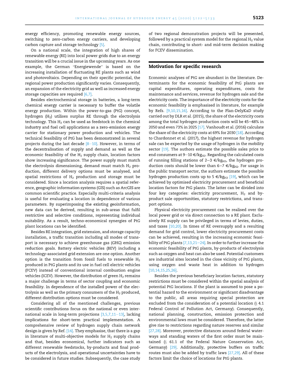 除了在电池中进行电化学储存外,还需要一种长期的化学能量载体来缓冲挥发性能量的产生。在气-电(PtG)概念中,氢(H2)通过电解技术利用多余的稀土。这种氢气可作为化工原料和燃料电池应用,作为固定能源生产和车辆的零排放能源载体。在过去的十年中,PtG的技术可行性已经在几个项目中得到了证明。然而,从供需分散以及H2供应链的经济可行性来看,区位因素显示出越来越重要的意义。电源必须与电解尺寸相匹配,需求必须与产氢相匹配,必须分析不同的输送方案,必须考虑氢气生产和储存的空间限制。由于位置分析需要空间参考,地理信息系统(GIS)如ArcGIS是常见的科学实践。特别是多准则分析对于根据各种参数评估位置非常有用。通过叠加现有的地理信息,可以得到新的数据,从而形成满足限制性和选择性条件的子区域,代表个人的适宜性。因此,可以确定PtG工厂位置的技术经济协同效应。