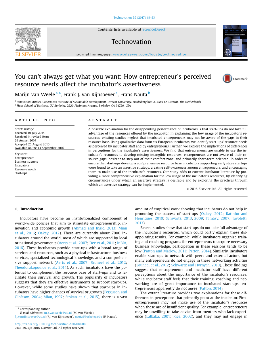 英文文献:You cant always get what you want: How entrepreneurs perceived resource needs affect the incubators assertiveness