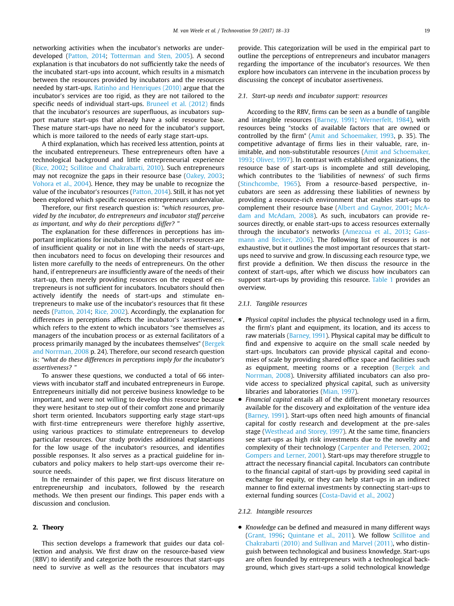 该部分设计了一个框架,以此来指导我们数据收集和分析。首先,我们利用资源基础理论(RBQ)来识别和分类初创企业用于生存的资源以及孵化器可能提供的资源。这一分类将在实证部分用于概述企业家和孵化器管理人员对孵化器资源重要性的看法。然后,我们通过讨论孵化器自信的概念,探讨孵化器如何干预孵化过程。