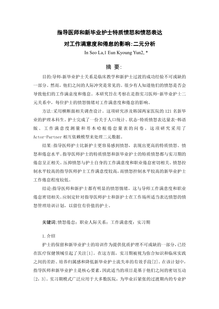 Keywords Anger burnout; Professional interpersonal relations; Job satisfaction Preceptorship
