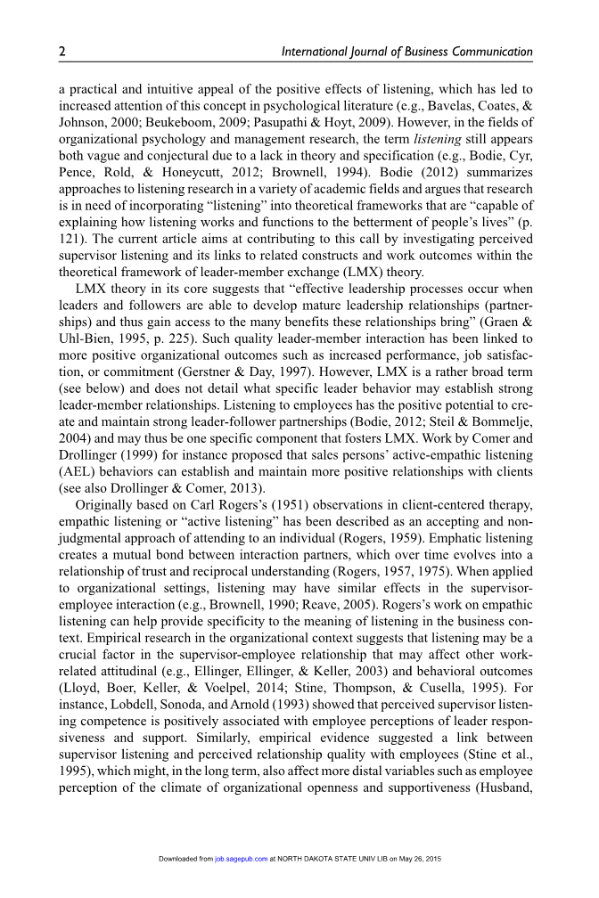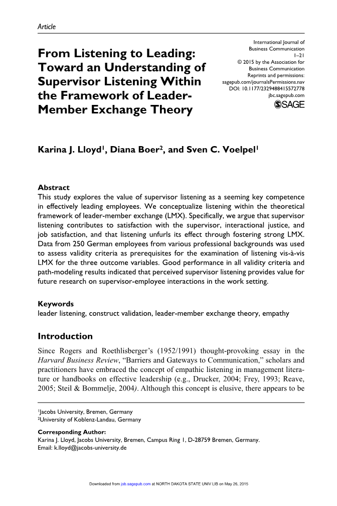 LMX建构的内在成分范围似乎相当广泛,触及各种成分,如支持、回应和考虑等,为实际行为和人际感知留出了空间,从而引发了强关系的建立。该理论并没有具体说明哪种具体的行为能培养出这种强有力的领导者与追随者的关系。倾听---作为一种积极表现出接受追随者意见和建议的手段(Bass amp; Avolio, 1994; Spears, 1995)--可能是发展可持续的领导者-追随者关系的一个可行的组成部分。由于倾听能够促进相互理解和信任的发展(Lloyd, Boer, Kluger, amp; Voelpelel, 2014; Stine et al. 从长远来看,这将促进进一步的良性互动、相互合作和支持。不可避免地,这也会促进进一步的沟通。换句话说,倾听和领导者与成员之间的互动是相互交织的;然而,特别是在关系的早期阶段,倾听可能会产生有益的效果,即创造出强有力的领导者与成员之间的互动,而这两者都将与组织的结果产生积极的联系。在这篇文章中,我们研究了倾听质量可能会先于LMX的发展,即提出了倾听质量对LMX产生积极影响的序列,然后对结果产生积极的贡献。