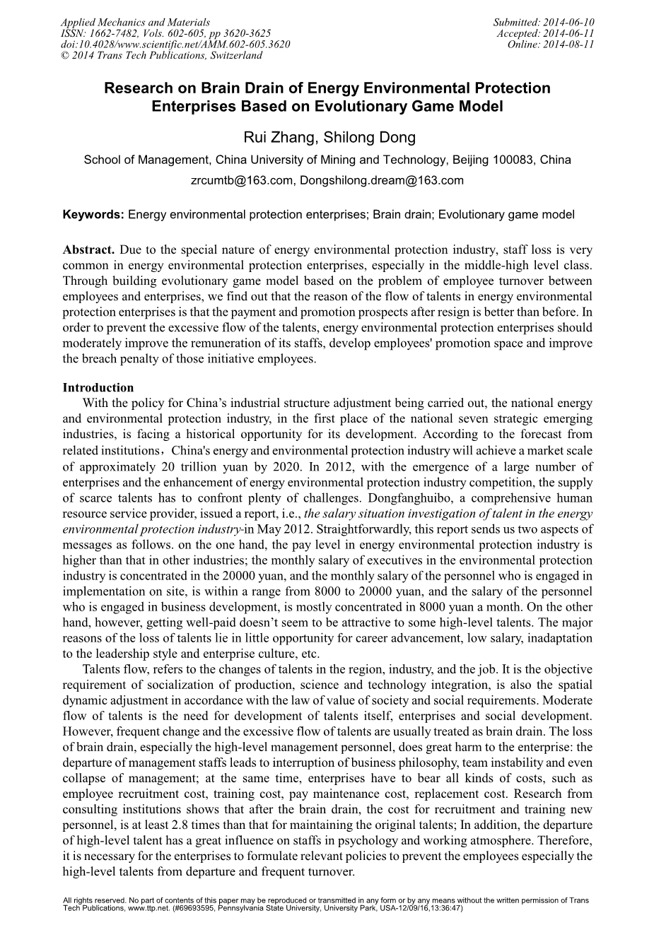 基于演化博弈模型的能源环保企业人才流失研究张瑞,董士龙