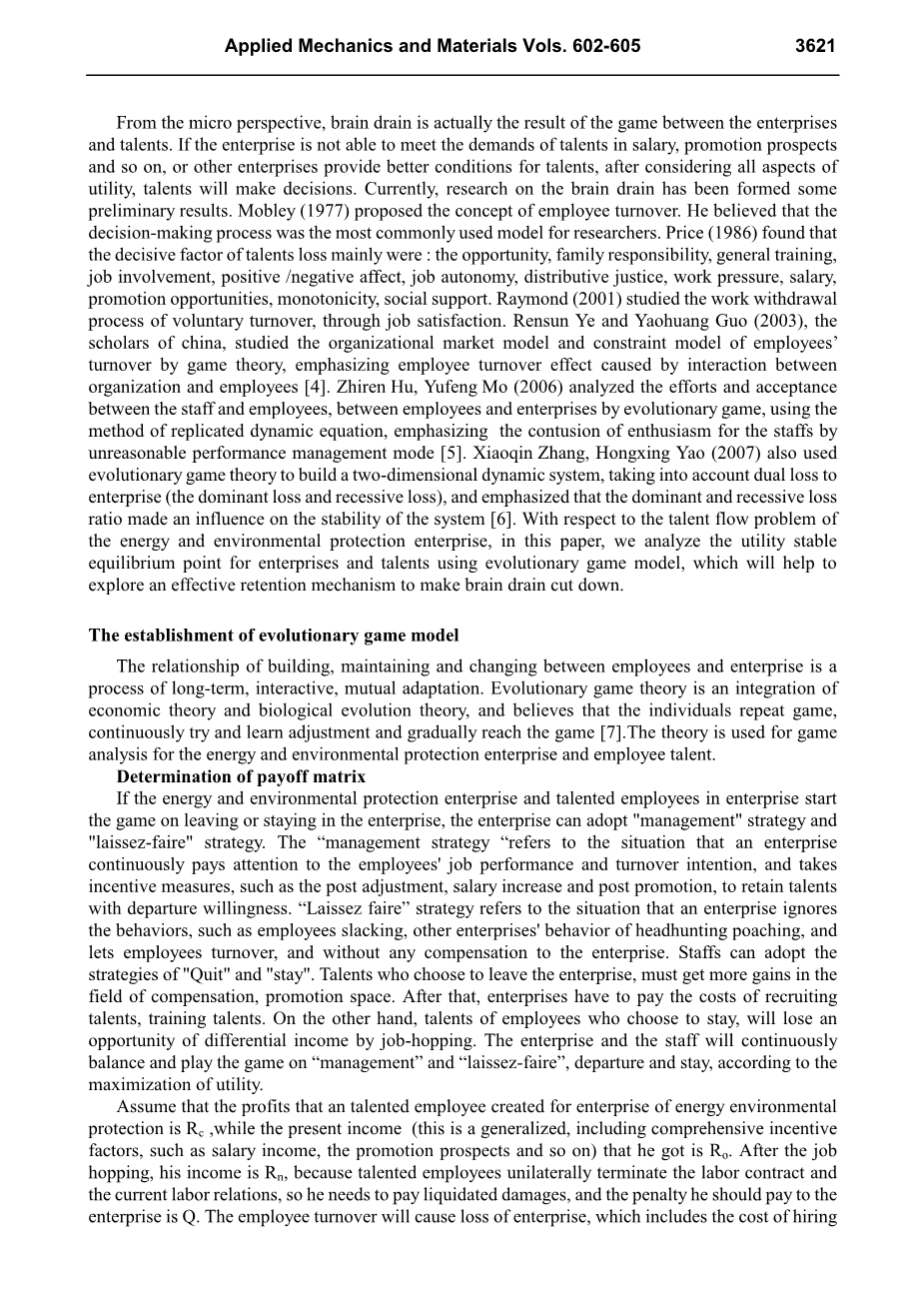 (1986)发现,人才流失的决定性因素主要是:机会,家庭责任,一般培训,工作参与,积极/消极影响,工作自治,分配正义,工作压力,薪水,晋升机会,单调性,社会支持。Raymond(2001)通过工作满意度研究了自愿离职的工作退出过程。中国学者叶仁孙和郭耀煌(2003)用博弈论研究了员工离职的组织市场模型和约束模型,强调了组织与员工之间的互动引起的员工离职效应[4]。胡志仁,莫玉凤(2006)采用动态博弈的方法,通过进化博弈分析了员工之间,员工与企业之间的努力和接受程度,强调了员工绩效的不合理绩效管理模式对员工积极性的挫折[5]。 ]。张晓琴,姚洪星(2007)也考虑了企业的双重损失(显性损失和隐性损失),运用演化博弈理论构建了二维动态系统,并强调了显性损失率和隐性损失率关于系统的稳定性[6]。针对能源和环保企业的人才流动问题,本文采用演化博弈模型分析企业和人才的效用稳定均衡点,这将有助于探索有效的人才保留机制,以减少人才流失. .