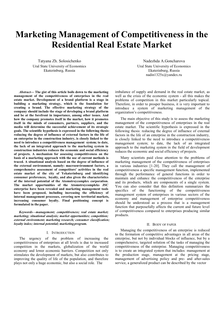 摘要——本文的主旨归结为房地产市场中企业竞争力的营销管理。品牌平台的开发是建立营销战略的一个阶段,是创建品牌的基础。公司的有效营销策略应该包括开发品牌平台的阶段,并在其他问题中处于重要地位。公司如何在市场上推销自己,如何在消费者、合作伙伴、供应商和媒体的心目中推销自己,将决定其战略目标的成功实现。这一科学假设表现在以下论点中:降低建筑行业企业生活中外部因素的影响程度,与引入竞争力管理系统的必要性密切相关;迄今为止,建筑行业营销系统缺乏综合方法,降低了项目的经济和社会效率。追踪了一种利用现有方法在营销方法基础上评估竞争力的机制。基于外部环境影响程度的情景分析,即:宏观环境因素,对叶卡捷琳堡市房地产市场竞争对手活动的综合评估,确定消费者偏好、忠诚度,并给出Atomstroycomplex公司内部潜力的特征。Atomstroycompleks JSC企业的市场机会已经被揭示,营销管理工具已经被提出,包括提高内部管理过程的效率,覆盖新的地域市场,增加消费者忠诚度。论文阐述了最终定位概念。