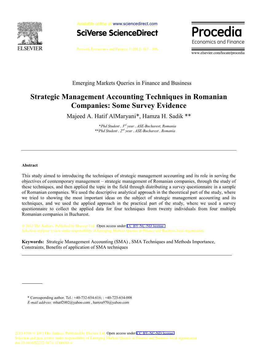 当我们回顾这个问题时,我们发现了许多研究和作家试图从几个角度研究这个主题,斯文森(2003):研究了目标成本法在各种行业中的应用,即成功的程度和可衡量的改进,以及影响这些应用成功的因素。而迪尔曼(2003),旨在调查跨国公司战略管理会计的现象。它试图获悉在一个特定的组织背景下的战略管理会计流程使用, 并且在德国的一家大型跨国公司开展这项研究。霍洛威(2006),试图批判性地评估战略管理会计的文献,即预算和公司治理,以及管理决策的文献(主要是领域的战略规划和变更管理)。查代日、吉尔丁(2007),旨在衡量斯洛文尼亚公司的发展水平,这个成功过渡到市场经济的国家。应用战略管理会计SMA技术,研究建立在国际调查, 并三个西方国家,即新西兰、英国、美国的SMA使用率进行了研究。而阿维亚特(2007),在他们的论文中,以技术教育学院(ITE)为例,使用平衡计分卡(BSC)作为战略管理系统,以提高职业教育和培训(VET)的质量和绩效,并以新加坡西理工学院校长的身份作为第一作者,进行案例研究。埃兹(2009),旨在调查酒店如何通过采用战略管理会计技术来提高经营绩效,获得竞争优势。为了实现这一目标,我们向尼日利亚3、4、5星级酒店的会计和部门经理发放了问卷,并使用了大约16种SMA技术。瓦尔斯特伦(2011),研究了不确定性、战略管理会计(SMA)和管理会计系统(MAS)之间的相互作用。研究的主要目的是探索SMA如何应用于优化价值链理论,重点是企业如何识别战略成本和价值导向特征,尤其是他们跨职能事务。叶鏊日发、奥斯卡瑞倪(2012)公布了英国特许报告师关于英国、澳大利亚和新西兰的制造、服务公司对于总成本的采用和实施。并且他们试图检查总成本在这三个国家 (即相对优势、相容性、易用性,结果论证可能性,可训练性)等对于决策者采纳和实施的重要性,包括成本和管理会计的创新。在罗马尼亚,卡帕罗斯尼(2006),在罗马尼亚纺织行业进行了一项研究, 从方法论的角度来看,研究基于成本作业法和其机会识别。并重点分析了管理会计和成本计算方法及其相关方面的阶段。根据罗马尼亚立法,尽管唐崔纳(2008),在他们的论文中试图展示关于成本的信息如何影响酒店业务决策过程的质量,以便分析各部门的绩效,并决定如何提高利润和所有服务的质量。柯乐琼(2008),试图通过比较两种最广泛采用的绩效管理框架EQFM和平衡记分卡,来讨论绩效度量技术这一主题。这些方法被用来解释战略控制和绩效测量如何有助于战略的实施和组织绩效的提高。而卡帕(2008),提出强调使用标杆法的必要性、应用方法、新过程的优点和缺点,以及相关的批评。同样,阿妮卡帕罗(2009),尝试在他的研究中使用一种关于成本分析模型和提供的管理和成本核算会计策略等信息使用的综合方法来提高性建筑材料行业表现。虽然任佳(2009),从多学科的角度研究了成本管理的主要方面,在这项研究的目标是介绍罗马尼亚企业管理者对会计管理产生的信息的态度,确定那些可以理解并与基本管理决策相关的成本计算和报告模型。任佳(2010),试图通过实证研究来确定罗马尼亚公司管理者对管理会计产生的信息的态度,认为在组织内部和外部,会计信息都是决策过程的基础。虽然德斯和皮特(2011),试图分析该领域的现有文献,以强调新的成本系统,如ABC和ABM可以是一对强大的组合来确保每个公司的竞争力和效率。另一个目标是展现,除了缺点,企业实施ABC / ABM系统,因为它允许更好的跟踪成本目标,优先将管理费用分配给成本目标,财务和非财务分析,以及对经理和管理会计师在决策过程中有用的措施。卡帕罗斯尼(2011),通过分析罗马尼亚企业采用作业成本法适应现代管理会计方法和管理会计组织假设的可能性,来展示作业成本法(ABC)的重要性在罗马尼亚的变化。