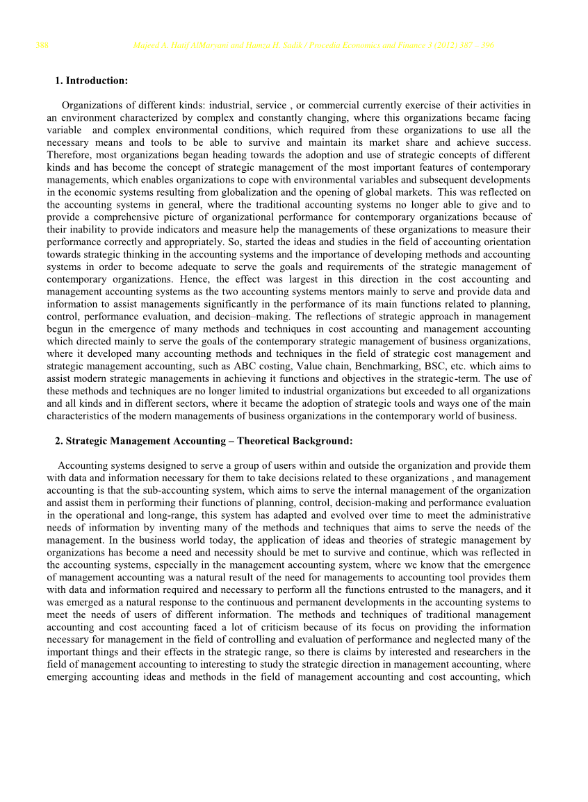 会计系统被设计去服务内部用户和组织外的用户,提供必要数据和信息帮助他们做出关于组织的决定。管理会计作为代替会计的制度,旨在服务组织的内部管理和帮助他们执行职务的计划、控制、决策和短期及长期绩效评估。随着时间的推移,这个系统已经通过创新方法和技术来满足管理需要。在当今的商业世界中,组织通过战略管理的想法和理论的实施,已经成为一种需要和必要来满足生存与发展,这反映在会计制度中,尤其是管理会计制度中,那里我们知道,管理会计的出现是管理层需要会计工具提供给他们要求的、必要的数据和信息来执行其作为管理人员的所有职能的一个自然的结果。管理会计的出现,是对满足用户不同信息要求的持续而长期发展的会计制度自然回应。传统管理会计和成本会计的方法和技术面临很多的批评,因为它专注于提供必要的信息给控制领域的管理和绩效考核,而忽视了许多重要的事情和其在战略领域的影响。因此,管理会计领域的研究人员和有兴趣的人都声称愿意研究管理会计中的战略方向。由此,出现了管理会计和成本会计领域中的会计思想和方法。所谓管理会计中的战略方法,是指在经营范围之外关注战略的程度,它成为联系会计与当代组织工作的战略管理的纽带。当前的竞争压力,使得全球国际贸易呈现自由化趋势,同时许多大企业的集团通过价值链的整合达成支持市场经济的力量。这也迫使许多公司需要采用竞争战略工具作为一种独特的途径去竞争,以确保生存和发展。这就需要发展它们的行政和会计结构,包括管理会计系统,作为在不确定的情况下各级管理决策的主要资料来源,以及编制决策过程中,遇到困难时的重要参考资料;因为客户需求的快速变化,技术发展也快。因此,管理会计的发展方向是战略方法作为一种面向当前发展的工具。而这里也出现了很多方法和技术在战略管理会计、战略成本管理领域,通过实现对成本降低和供应链管理的数据和信息的高效、有效控制来帮助其功能的长期和战略性表现。在寻找战略管理会计的起源时,我们发现,在80年代后期,英国特许管理会计协会对管理会计的发展进行了调查,并得出了1989年报告(管理会计:路径的方法进展),和之后在1994年重新拟定的这份报告说,杜瑞(2000):没有全面的战略管理会计概念框架,但它正在为管理层提供必要的信息,以便对未来可能遇到的变化提前发出预警。管理会计的学者和研究人员试图提交战略管理会计的定义,英尼斯将其定义为:为支持组织的战略决策提供信息,其中包括长期和外部因素。而布朗维奇(1990)认为:提供和分析一个组织的产品市场的财务信息,竞争对手的成本、成本结构和战略管理给市场上的竞争对手。因此,我们可以为战略管理会计提供如下定义:为组织战略的制定提供信息和支持它的实现通过鼓励行为符合组织的战略,通过会计方法的应用来降低成本、提高产品质量和性能评价,以实现组织的战略,在不断变化的市场中保护组织的竞争地位和持续开展工作。