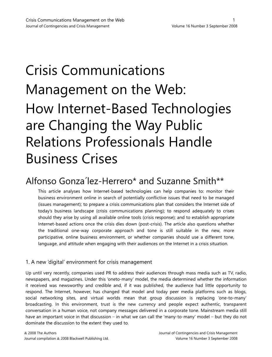 本文分析了基于互联网技术如何帮助企业:在线监控其业务环境,寻找需要管理的潜在冲突问题(问题管理);准备一份危机沟通计划,考虑当今商业环境中互联网方面的问题(危机沟通计划);以及通过使用所有可用的在线工具(危机应对),充分应对危机;并在危机结束后(危机后)建立适当的基于互联网的行动。本文还探究了传统的单向企业方法和语调是否仍然适用于新的、更具参与性的在线商业环境,或者企业在危机情况下与互联网上的受众接触时是否应使用不同的语调、语言和态度。