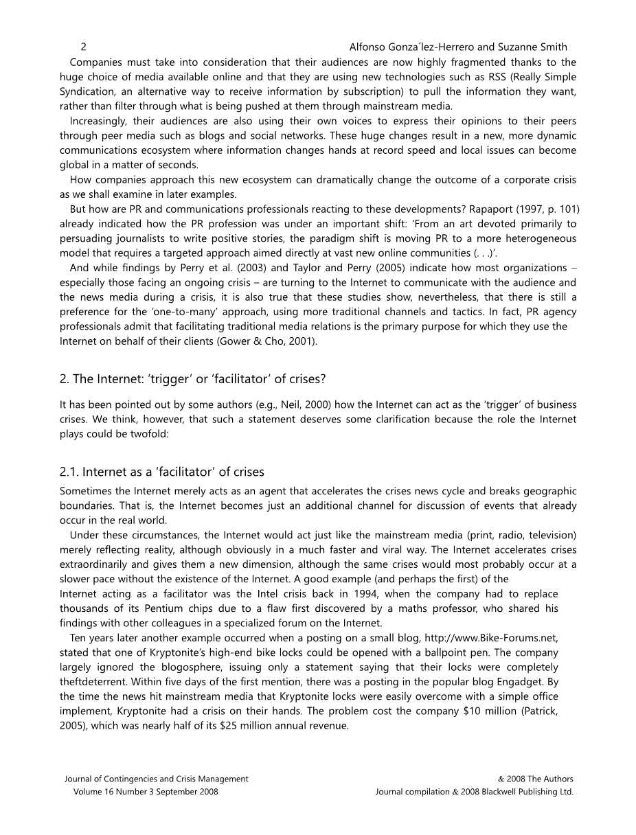 然而,然而,一些作者(例如,特恩布尔,2000年)认为,技术变革只会加剧问题和危机,而不是制造新形式的危机。当然,在某些情况下,很难区分互联网是危机的“促进者”还是“触发器”。从专业的角度来看,这可能没什么区别。无论互联网的理论作用如何,公关专业人员都必须考虑到谣言可能首先出现在互联网上(在讨论论坛,个人博客和虚拟世界,如Second Life ......)并保留在那里,或者也可能跳到真实世界世界被主流媒体认为是真实的,这将加剧危机的负面影响。