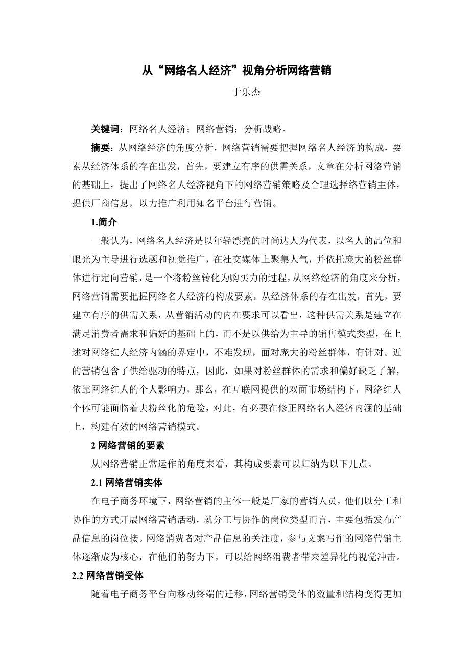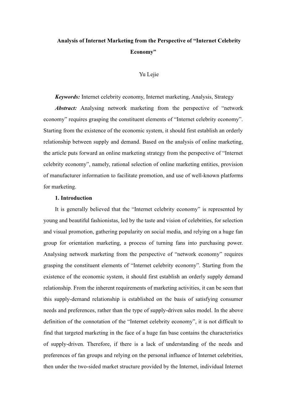 从“网络名人经济”视角分析网络营销外文翻译资料 2023-04-16 11:48:29 英语原文共 6 页,剩余内容已隐藏,支付完成后下载完整资料 英语译文共 5 页,剩余内容已隐藏,支付完成后下载完整资料 资料编号:[589108],资料为PDF文档或Word文档,PDF文档可免费转换为Word 原文和译文剩余内容已隐藏,您需要先支付 30元 才能查看原文和译文全部内容!立即支付 发小红书推广免费获取该资料资格。点击链接进入获取推广文案即可: Ai一键组稿 | 降AI率 | 降重复率 | 论文一键排版 PREVIOUS NEXT 您可能感兴趣的文章 精益管理-精益管理方法在酒店业中的应用外文翻译资料 主题公园外文翻译资料 财务报表的可持续发展和重新概念化外文翻译资料 关于被选择公司的财务分析外文翻译资料 葡萄酒和文化遗产:阿尔托杜罗河葡萄酒产区的经验外文翻译资料 创意经济、文化产业与地方发展外文翻译资料 我国商业银行个人理财业务的战略研究与发展现状外文翻译资料 大学生的信用卡消费外文翻译资料 成功的学前儿童语音意识教学:课堂经验外文翻译资料 剑桥中国文学史外文翻译资料