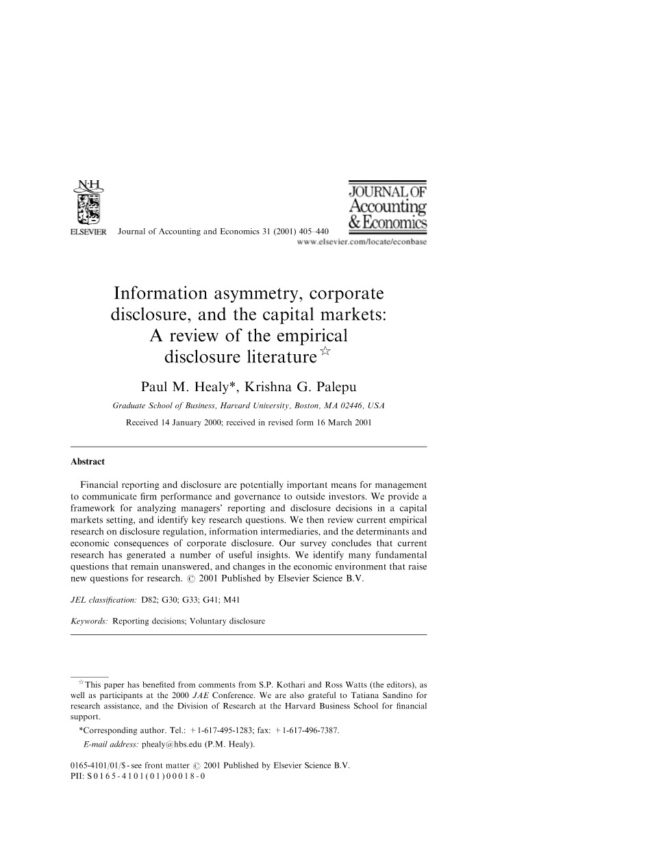 Paul M. Healy*, Krishna G. Palepu.Information asymmetry, corporate disclosure, and the capital markets: A review of the empiricaldisclosure literature[J]. Journal of accounting and economics, 2001