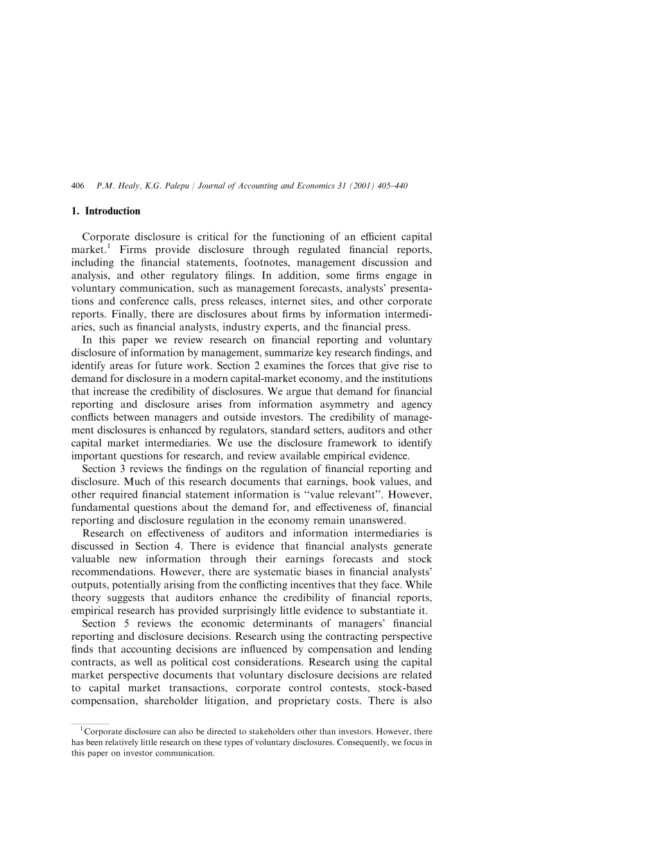 关于自愿披露的研究集中在财务报告对资本市场的信息作用(见Healy和Palepu, 1993, 1995)。本研究通过关注股票市场对会计和披露决策的动机,补充了积极的会计文献。披露研究假设,即使在一个有效的资本市场,经理人对于公司未来预期业绩的信息也优于外部投资者。如果审计和会计法规运作良好,管理者的会计决策和披露就会向外部投资者传达公司商业经济的变化。或者,如果会计监管和审计是不完善的,更有可能的是,管理者在做出会计决策和披露之间进行权衡,以向投资者传达他们对公司业绩的卓越了解,并出于合同、政治或公司治理的原因管理报告的业绩。因此,管理层自愿披露信息的动机及其可信度是一个有趣的实证问题。下面,我们讨论关于这些问题的实证证据。我们还单独分析了研究的潜在局限性,其中许多是跨研究共享的。