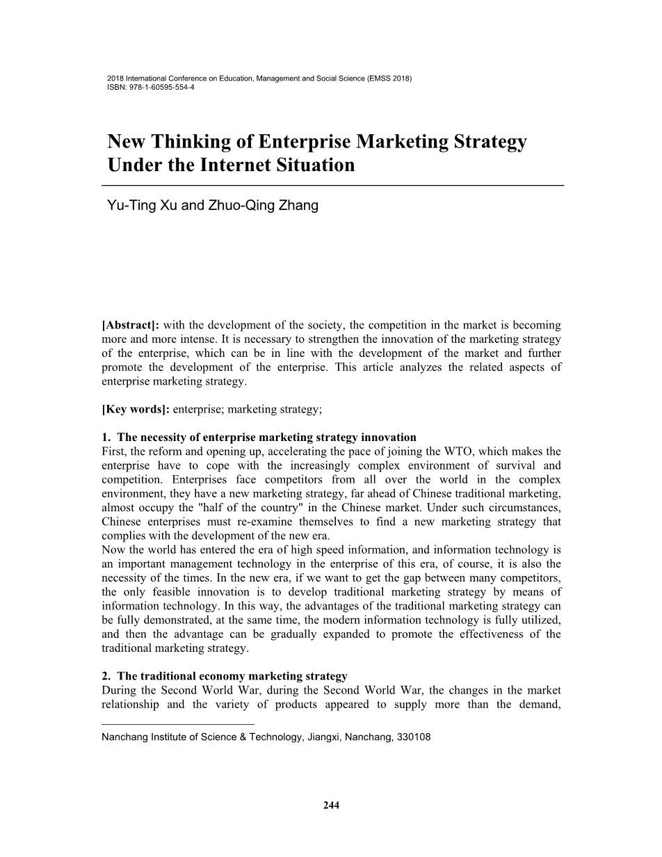 总之,企业要想在激烈的市场中生存并获得经济效益,实施企业营销战略的创新是非常重要的,也是进一步加强营销管理的一个非常关键的方法。
