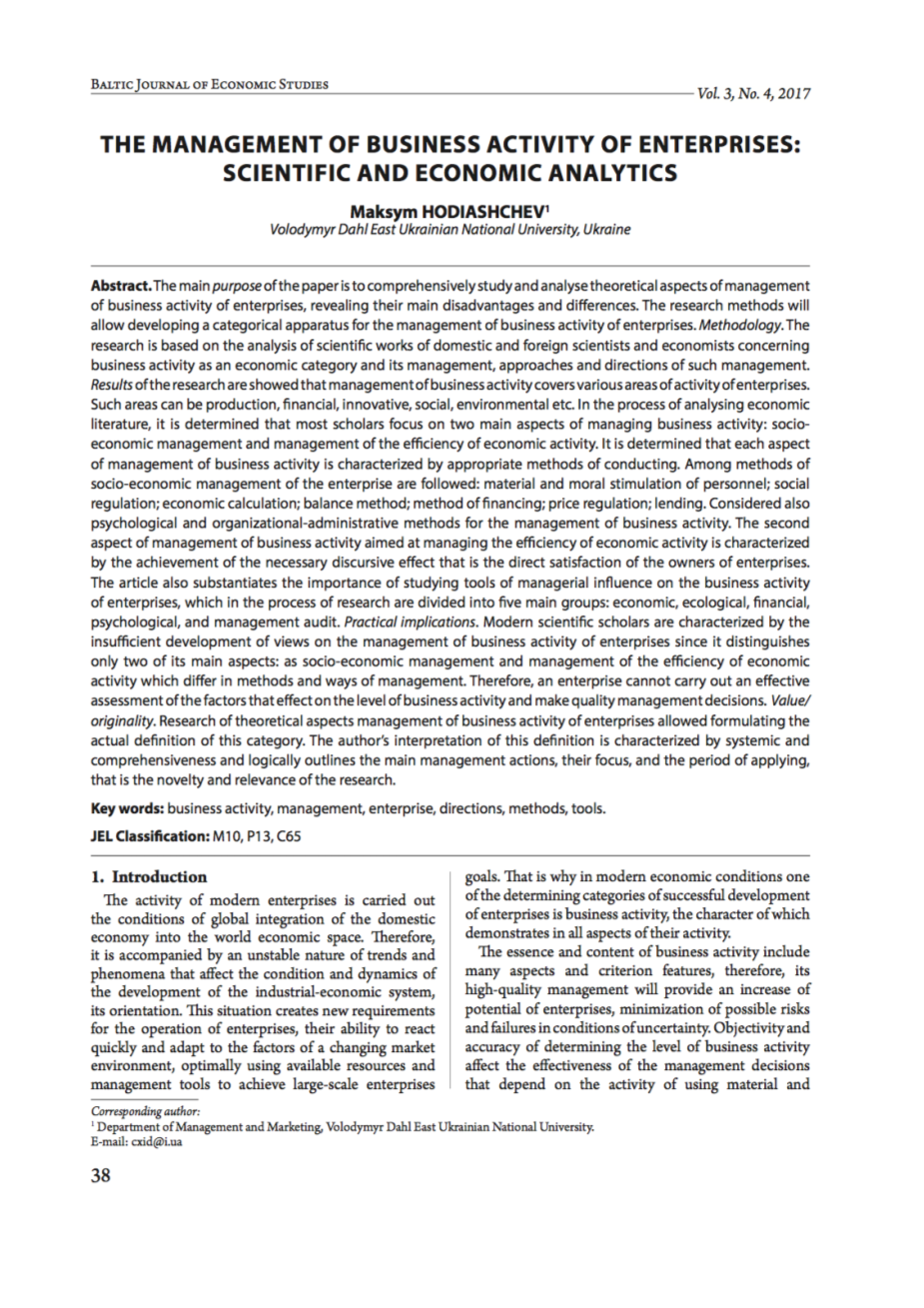 摘要本文的主要目的是全面研究和分析企业经营活动管理的理论方面,揭示其主要的不足和差异。研究方法将允许开发一种用于管理企业业务活动的分类设备。方法。该研究是基于对国内外科学家和经济学家关于商业活动作为经济范畴的科学着作及其管理,方法和方向的分析。研究结果表明,商业活动的管理涵盖了企业的各个活动领域。这些领域可以是生产,金融,创新,社会,环境等。在分析经济文献的过程中,确定大多数学者关注管理商业活动的两个主要方面:社会经济管理和经济活动效率管理。确定商业活动管理的每个方面都以适当的执行方法为特征。在企业的社会经济管理方法中遵循:人员的物质和道德刺激;社会规制;经济计算;平衡法;融资方式;价格监管;放贷。还考虑了商业活动管理的心理和组织管理方法。旨在管理经济活动效率的商业活动管理的第二个方面的特点是实现必要的话语效应,这是企业所有者的直接满足。文章还证实了研究管理影响工具对企业商业活动的重要性,在研究过程中将其分为五大类:经济,生态,金融,心理和管理审计。实际影响。现代科学学者的特点是企业的商业活动管理观点不够充分,因为它只区分了两个主要方面:社会经济管理和经济活动效率管理,这些管理方法和管理方式不同。因此,企业无法对影响业务活动水平的因素进行有效评估,并做出质量管理决策。价值/原创性。对企业商业活动的理论方面管理的研究允许制定该类别的实际定义。作者对该定义的解释具有系统性和全面性,并在逻辑上概述了主要的管理行为,重点和应用时期,即研究的新颖性和相关性。