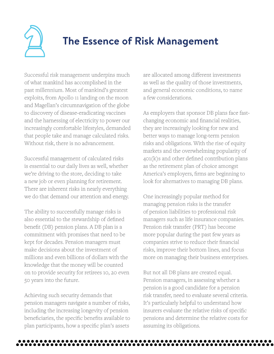 马萨诸塞州互助人寿保险公司(Massichusetts Mutual Life Insurance Co.)通过对这些问题的讨论,试图通过专业风险经理的视角,为成功的PRT提供“内部”视角。了解人寿保险公司如何看待和评估不同的风险、管理风险并最终决定某一特定风险是否值得承担,对于正在考虑PRT或其他选择来管理其养老金义务的雇主来说,这是很有帮助的。