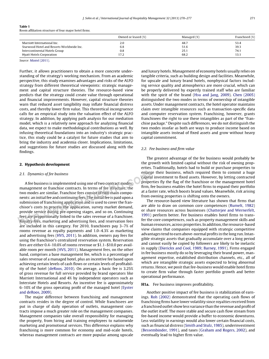在过去的几十年里,美国的许多连锁酒店已经改变了他们的商业策略。上世纪80年代,万豪国际集团(Marriott International Inc.)和希尔顿全球酒店集团(Hilton Hotels worldwide - wide)等品牌开始削减资产负债表上的资产,专注于利润更高、资本密集度更低的收费物业运营业务(Hudson, 2010)。大多数房产销售之后都是管理合同:卖方仍在经营房产,业主为卖方(现为经营者)提供的服务支付费用。例如,在2010年底,喜达屋酒店及度假村国际集团(Starwood Hotel and Resorts Worldwide Inc.)根据长期管理协议运营了463家酒店,根据特许经营合同运营了502家酒店。这比2000年底增加了50%以上。相比之下,喜达屋拥有或租赁的房产数量也大幅下降:从2000年的162套下降至2010年的62套。这意味着减少了60%以上。表1总结了四大连锁酒店的客房隶属结构。他们实际拥有或租赁的房间比例不到18%,而他们旗下80%以上的房间是通过收费合同业务运营的。