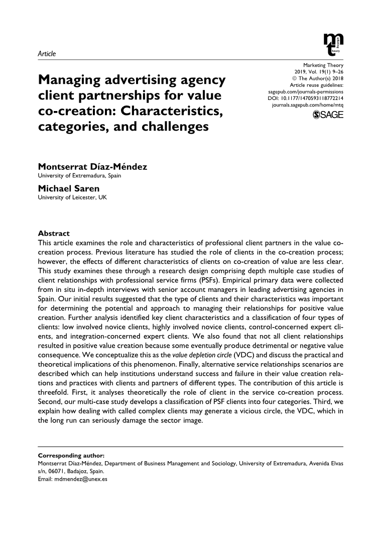 摘要:本文考察了专业客户伙伴在价值创造过程中的作用和特点。以往的文献对共同创造过程中客户的作用进行了研究,但不同的客户特征对共同创造价值的影响尚不明确。本研究通过一个研究设计来检验这些,该设计包括与专业服务公司 (PSFs) 的客户关系的深度多案例研究。实证主要数据来自对西班牙主要广告公司高级客户经理的实地深入访谈。我们的初步结果表明,客户的类型和他们的特点对于确定为积极的价值创造管理他们的关系的潜力和方法是重要的。进一步分析确定了关键客户特征,并将客户分为 4 类:低参与度的新手客户、高参与度的新手客户、关注控制的专家客户和关注整合的专家客户。我们还发现,并不是所有的客户关系都会产生积极的价值创造,因为有些关系最终会产生有害的或消极的价值后果。我们将其概念化为价值消耗圈 (VDC),并讨论了这一现象的实际和理论意义。最后,描述了替代服务关系场景,可帮助机构了解与客户和不同类型合作伙伴的价值创造关系和实践的成功和失败。这篇文章的贡献有三个方面。首先,从理论上分析了客户在服务共同创造过程中的作用。第二,我们的多案例研究将 PSF 客户分为四类。第三,我们解释如何处理被调用的复杂客户机可能会产生一个恶性循环,即 VDC,从长远来看,这可能会严重损害部门的形象。