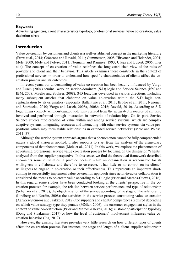 客户和客户共同创造价值是营销文献中公认的概念(Frow et al.,2014;Gro nroos and Ravald,2011;Gummesson,2008;Hirvonen and Helander,2001;Mele,2009;Mele and Polese,2011;Normann and Ramfi rez,1993;Ulaga and Eggert,2006 等)。价值共同创造的概念重新定义了长期以来关于提供者和客户角色及其行为的观点。本文在专业服务的背景下研究了这些结构,以了解客户的具体特征如何影响创造过程及其结果。