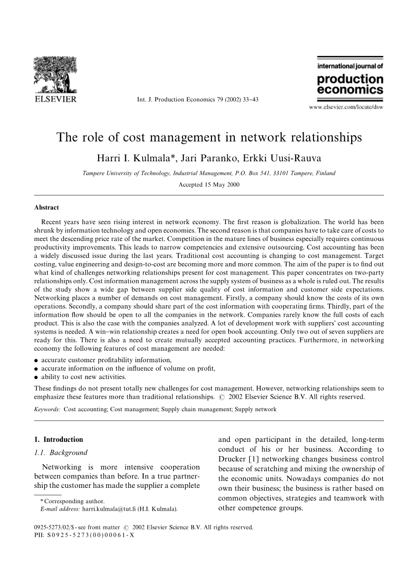 这些发现并没有给成本管理带来全新的挑战。然而,网络关系似乎强调这些特征比强调传统关系更重要。2002 Elsevier Science B.V.保留所有权利。