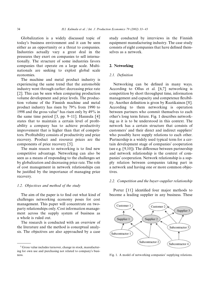 成功的芬兰网络的例子有AhlstroK,诺基亚,Puustelli和Nordberg。H.I. Kulmala等。 / Int。 J. Production Economics 79(2002)33} 43 35油漆成分。以美元(4美元)报告节省的成本。AhlstroK m网络由造纸机械供应商组成,成立于1991年。从那时起,受雇人员从100人增加到300人,网络合作伙伴的营业额从60增加到150MFIM。 只有一家公司破产。 一家美国汽车制造商已经为一家粘合剂供应商在产品开发方面发挥了重要作用,并且每辆车可以节省高达25 FIM的成本。