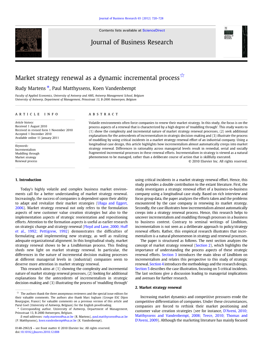 当今商业市场环境的高度多变和复杂,要求我们更好地理解市场战略的更新。越来越多的公司的成功,取决于它们是否有能力调整和改善其市场战略(Eggert,2006)。市场战略更新不仅指新的客户价值创造战略的制定方面,也指战略调整和重新定位努力的实施方面。对形成方面的重视是有用的,因为早先关于战略变化和战略更新的研究(Floyd和Lane,2000;huff等人,1992;Petigrow,1992年)表明了制定和执行新战略的困难,以及实现适当的组织协调的必要性。在这一纵向研究中,市场战略的更新显示是一个Lindblom过程。这一发现为市场战略的更新提供了新的线索。特别是在更新市场战略时,(工业)公司各级管理层增量决策过程的性质不同,这一点值得更多注意。