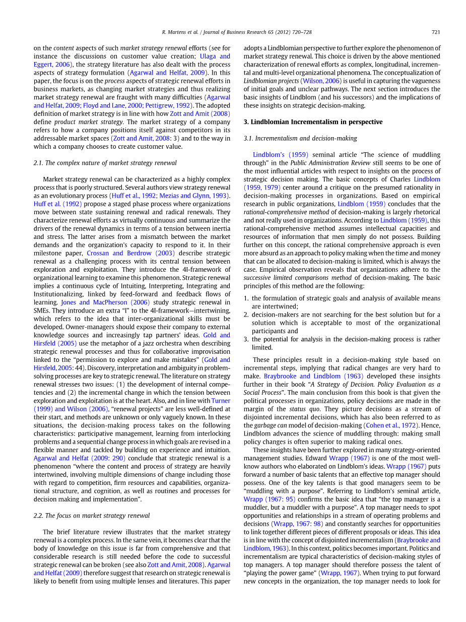 简要的文献回顾表明,市场战略更新是一个复杂的过程。同样,很明显,关于这一问题的知识还远远不够全面,仍然需要进行大量研究,才能打破成功的战略更新守则(另见Zott 和Amit, 2008)。因此,Agarwal和Helfat (2009)认为,对战略更新的研究可能得益于使用多个透镜和文献。本文从lindblomian的角度进一步探讨了市场战略更新的现象。这一选择是由上述将更新工作描述为复杂的、纵向的、渐进的和多层次的组织现象所驱动的。lindblomian项目的概念化(Wilson, 2006)对于捕捉最初目标的模糊性和不清晰的路径是很有用的。下一节介绍Lindblom(以及他的继任者)的基本见解,以及这些见解对战略决策的影响。