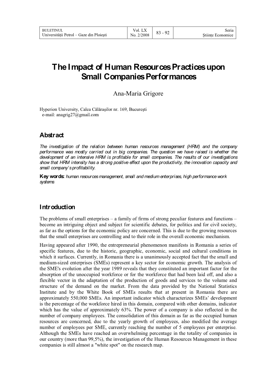 人力资源管理(HRM)与企业绩效关系的调查主要是在大公司进行的。我们提出的问题是,密集型人力资源管理的发展是否对小公司有利。研究结果表明,人力资源管理强度对企业的生产力、创新能力和盈利能力具有较强的正向影响。