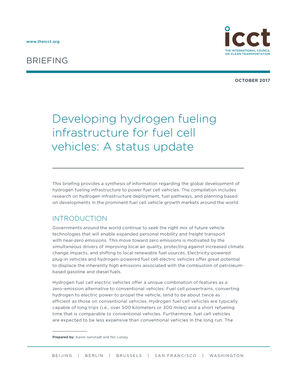 该概要提供了关于为燃料电池车辆提供动力的氢燃料基础设施的全球发展综合信息。 该报告包括以下全球性研究调查内容:氢基础设施部署、氢燃料生产途径设和燃料电池汽车市场发展的调查,燃料途径和规划的研究。
