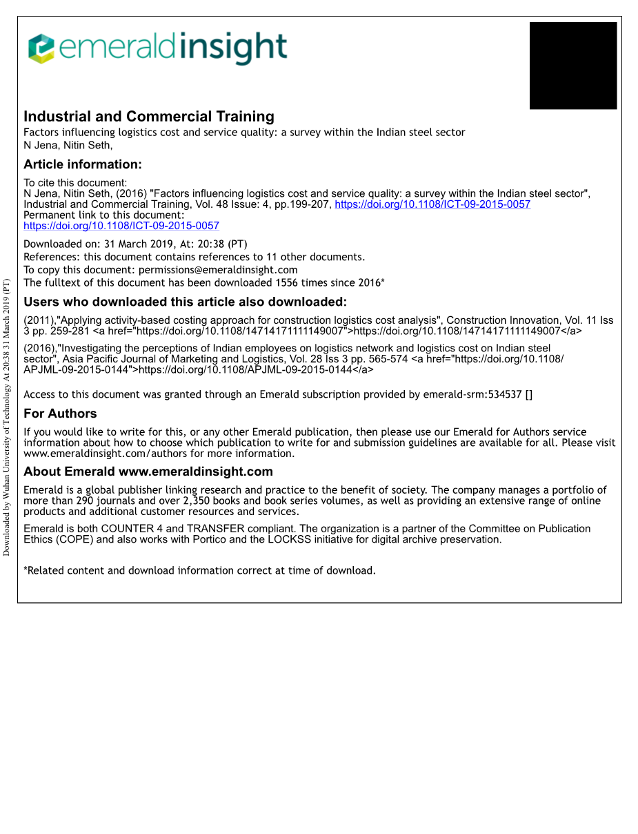 创意/价值:据作者所知,本研究首次尝试研究印度钢铁制造业背景下物流成本要素与服务质量的关系。钢铁行业的物流成本被认为是本研究中企业家的最佳绩效衡量标准之一。