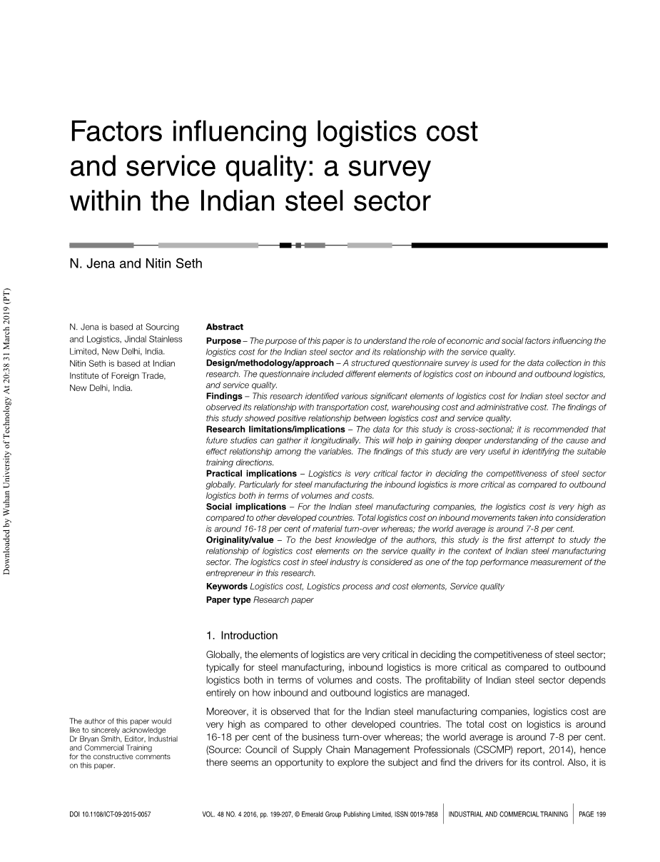 目的:本文的目的是了解影响印度钢铁行业物流成本的经济和社会因素的作用及其与服务质量的关系。