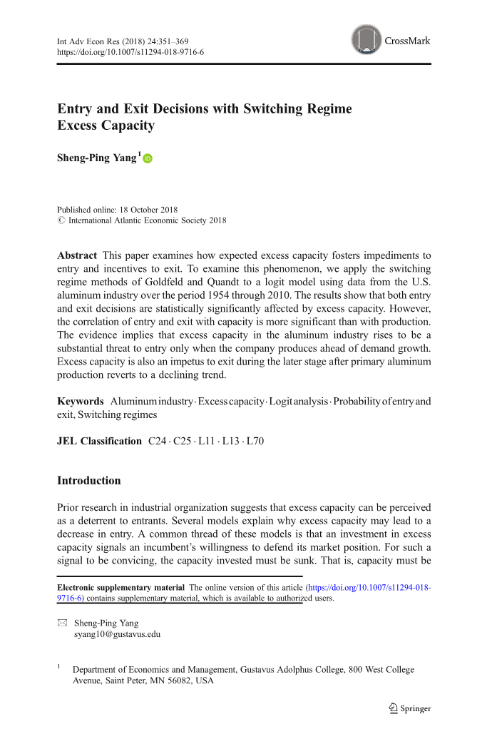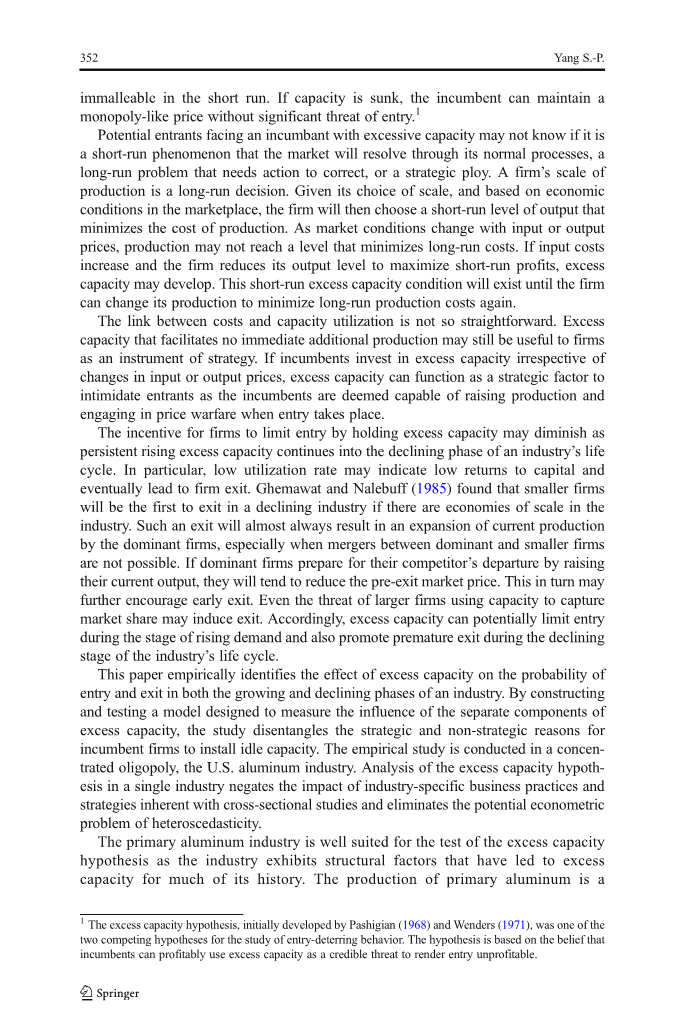 先前在工业组织的研究表明,产能过剩可以被视为对进入者的 威慑。一些模型解释了为什么产能过剩会 导致进入量量减少。这些模型的一个共同点 是,对过剩产能的投资表明了现任者愿意 捍卫其市场地位。要使这种信号恢复正 常,必须降低投资能力。也就是说,容量量 必须为Int Adv Econ Res(2018)24B351–369https://doi.org/10.1007/ s11294-018-9716-6电子补充材料本文 的在线版本(https://doi.org/10.1007/s11294-018-9716-6)包含补充材料, 授权用户可以使用。*Sheng Ping Yang syang10@gustavus.edu 1美国明尼苏达 州圣彼得西学院大道800号gustavus adolphus学院经济与管理理系,短期内不可 行。如果产能下降,在职者可以维持垄断 价格,而不存在重⼤大的进入威胁。1面临产 能过剩问题的潜在进入者可能不知道市场 是否会通过正常流程、需要采取行行动纠正 的长期问题或战略略策略略来解决短期现象。 公司的生产规模是一个长期的决定。考虑 到规模的选择,以及市场的经济条件,该 公司将选择一个短期的产出水平,以最大 限度地降低生产成本。由于市场条件随着 投入或产出价格的变化而变化,生产可能 无法达到最小化长期成本的水平。如果投 入成本增加,企业降低产出水平,以实现 短期利利润的最大化,则可能会产⽣生过剩产 能。这种短期产能过剩的状况将一直存 在,直到该公司能够改变其生产,以再次 最小化长期生产成本。成本和容量量利利用之 间的联系并不不是那么简单。产能过剩,不 利于立即增加产量量,作为一种战略工具,可能对企业仍然有用。如果在职者投资于 产能过剩,而不管投入或产出价格的变 化,产能过剩可以作为一个战略因素来威 胁进入者,因为在职者被认为有能力提高产量,并在进入时参与价格战。随着持续增长的过剩产能继续进入行业生 命周期的衰退阶段,企业通过持有过剩产 能来限制进入的动机可能会减弱。特别 是,低利用率可能意味着资本回报率低, 最终导致企业退出。Ghemawat和 Nalebuff(1985)发现,如果该行业存 在规模经济,那么规模较小的公司将首先 退出衰退的行业。这种退出几乎总是会导 致主导企业扩大目前的产量量,尤其是在主 导企业和小企业之间无法合并的情况下。 如果主导企业通过提高当前产量为竞争对 手的离开做准备,他们将倾向于降低退出 前的市场价格。这反过来可能进一步鼓励 提前退出。即使是更更大的公司利用能力占 领市场份额的威胁也可能导致退出。因 此,产能过剩可能会限制需求上升阶段的 进入,也可能进行业生命周期衰退阶段 的过早退出。本文从实证的角度分析了了产 能过剩对一个产业成长期和衰退期进出口概率的影响。通过构建和测试一个模型来 衡量量过剩产能的单独组成部分的影响,研 究阐明了现有企业安装闲置产能的战略和 非战略原因。这项实证研究是在一个集中 寡头垄断的美国铝业中进行的。 对单一行业的过剩产能假设的分析否定了行业特定的商业实践和横向研究固有的战 略的影响,消除了潜在的异方差经济计量量 问题。原铝行业非常适合于过剩产能假设的检验,因为该行业展示了导致其大部分历史产能过剩的结构性因素。初级铝的生 产是一个1过剩产能假设,最初由 Pashigian(1968)和Wenders(1971) 提出,是研究进入抑制行为的两个相互竞 争的假之一。这一假设是基于这样一种 信念念,即在职者可以将过剩的产能作为一 种可信的威胁,使进入变得无利利可图。 352杨世平资本密集型流动过程,其中产 能约束在行业定价和生产中起着重要作 用。因此,随着生产商在未来需求之前进 行建设,行业通常会建立并维持超过可能 需求的产能。2如图1所示,铝行业的装机 容量量总是超过采样期的产量。此外,规模 经济和广泛的铝生产一体化限制了战后美 国铝市场的竞争程度。铝工业的进入壁垒 在很大程度上取决于初级铝所需的生产规 模。 特别是,技术的变化增加了炼油厂的最小 有效规模,并增加了潜在进入者的障碍。 贝恩(1956)对进入壁垒程度的研究表 明,铝行业在制造业中排名最高,进入壁 垒明显高于其他行业。美国铝供应包括三 个基本来源:一级、进口和二级复苏。几 十年来,原铝一直是美国市场铝供应的主 要来源。20世纪70年年代中期的经济衰退之 后,大多数一次铝生产商开始将更更多精力 集中在铝的二次熔炼上,这就大减少了电力需求。3这导致再生铝供应的快速增 长,导致一次铝供应呈下降趋势,如图2 所示。从20世纪90年年代初开始,美国主 要成为铝的净进口国,一次生产的份额稳 步下降,二次生产总体保持稳定。4我们 分别估计了了预期产能和产量量对企业退出和 进入铝行业的决定的影响。e过剩容量量的 组成部分。由于存在一个时间序列列变量量的 均值、方差和协方差可能随时间变化的潜 在问题,我们首先测试了时间序列列数据在 生产变量量和产能变量量之间的平稳性和可能 的协整性。然后,我们应用一个初步估计 值来生成生产和产能变化的预测值,随后 开发了一个逻辑模型,以根据⾏行行业的产能 和生产水平来估计企业进入和退出决策的 定性表示。 实证结果表明,在需求上升时,预期产能 扩张可能会先发制人,从而阻碍进入,一 旦上升趋势逆转,企业就会退出。然而, 不明显的是,额外的能力投资是为了防止 进入或迫使退出。事实上,研究结果表 明,产能扩张主要是由于在位者对未来需 