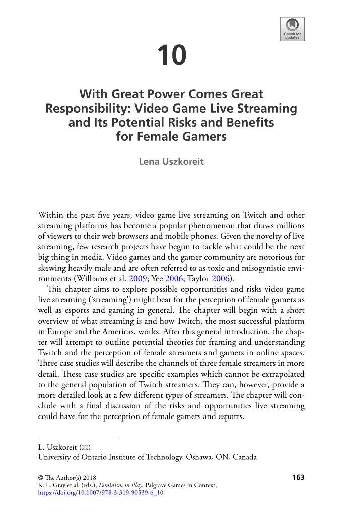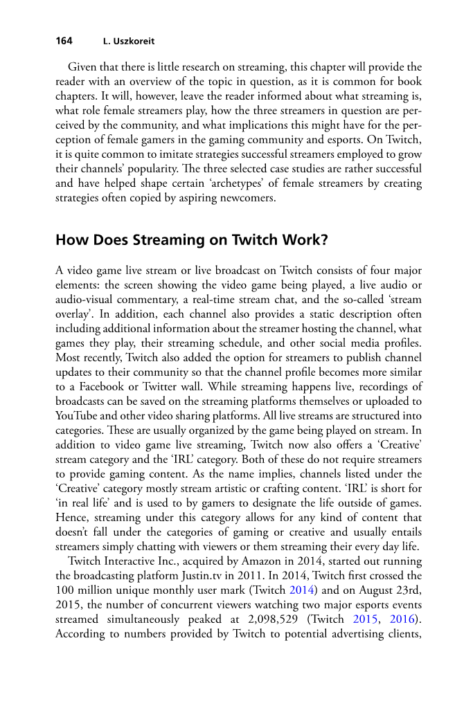 强大的力量带来巨大的责任:视频游戏直播hellip;一百六十六关于视频游戏直播流媒体平台的技术方面而不是社会科学的观点。似乎有一种对机会的迷恋行为通过抽搐收集到的数据可能会对质量产生兴趣,但不太感兴趣。社会互动。最近一项关于抽搐的研究调查了Twitch的动机。从使用和满足的角度看Twitch背后(SJ_Blom和Hamari,2016年)。在一项n=1097名Twitch观众的调查中,作者发现张力释放和社会释放之间存在正相关。综合和情感动机以及参与者的小时数观看Twitch的溪流。另一方面,社会整合动机最好解释订阅行为。换句话说,与其他观众交往而拖缆似乎是一个重要的动机,从成为特定流的订户和支持者的查看器。尽管作者努力解释观看Twitch的动机,缺乏不同渠道和观看动机之间的区别它们似乎削弱了这项研究的解释力。给定宽度不同抽动拖缆提供的内容范围以及他们关注的娱乐,似乎不太可能是动机解释时未指定观众选择观看、跟踪的频道,订阅。即使本章中突出显示的拖缆也具有以下特点:广泛的内容和观看它们的不同动机。最近的另一项研究是针对频道中的twitch用户的评论进行的Chats(Nakandala等人2017)。研究人员发现女性识别拖缆的频道通常包含与游戏无关的词。例如“胸部”、“宝贝”、“微笑”或“omg”。在频道中评论的观众但是,由男性识别拖缆托管,通常使用诸如“Melee”、“Glitch”、“Shields”或“Reset”,指拖缆的游戏内容从事研究人员的样本比较陈旧,缺乏对调查河流可能鼓励或惩罚某些词。然而,关于女性身份的过度表达渠道清楚地指向女性的客观形象并表现出对他们的游戏缺乏兴趣。这些结果与本章作者在2014年调查了Twitch的观众。研究发现假设的标准对于成功来说,男性和女性的彩带有很大的不同。观众相信游戏技巧和有趣的个性是重要因素对于男性彩带的成功,身体吸引力是最重要的。女性拖缆成功的标准(USzkoret 2015)。另一篇相关论文研究了Twitch作为社区的一个场所。汉密尔顿或哈密尔顿Garretson和Kerne(2014)探索了Twitch溪及其社区。作者采用定性的方法对一些Twitch溪流和他们培育的社区。Hamilton等人(2014)将奥尔登堡的“第三名”概念应用于Twitch。第三地方可以被描述为一个既不是家(第一)也不是家的地方。工作场所(第二名),但更确切地说是一个首先意味着用于交谈、交流和社区(Oldenburg 1997)。第三名的一个主要特征是成员的地位在第一和第二名,如年龄、富裕程度、教育程度,与其他成员交谈不重要。第三名水平状态。作者认为,Twitch通道及其特殊的亚文化围绕着它们形成的,可以说是第三位的游戏社区。在流式聊天中,社区成员聚在一起以一种开玩笑的方式交谈,他们的外部地位不起作用。如果Twitch频道可以作为游戏社区的第三名,女性彩带和观众的融入和表现是至关重要的。对他们来说,在谈判的规则、准则和规范社区。参与需要妇女受到平等职能的影响。确保成员在现实世界中的社会地位是次要的或不必担心。然而,通过分类和量化聊天内容评论,Nakandala等人(2017)证明,至少,流媒体女性不被认为是社区的另一个成员。