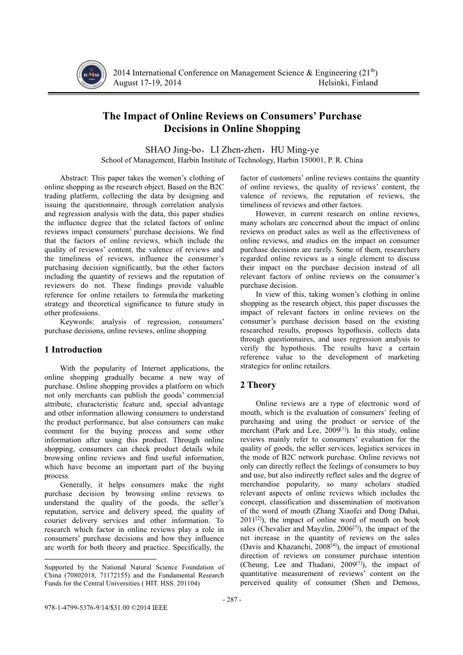 关键词:回归分析,消费者购买决策,在线评论,在线购物
