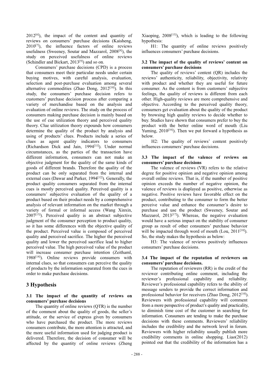 在线评论(QTR)的数量是购买产品的消费者给出的关于商品质量,卖家态度或快递服务的评论的数量。消费者贡献的评论越多,吸引的注意力就越多,并且用于判断产品的更有用的信息被传递。因此,消费者的决定将受到在线评论数量的影响(郑小平,2008 [15]),这导致了以下假设: