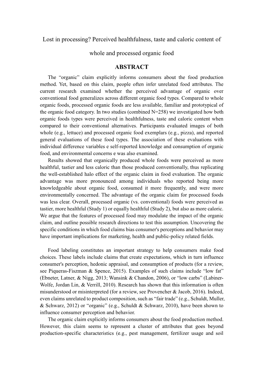 一些作者已经承认有必要研究使用不同类型产品的有机声明的影响。例如,Arvola等人(2008)选择了一个未加工(苹果)和加工食品(即食披萨)的例子,并测试了一个有机食品购买意向模型。作者认为,有机未加工食品(即全有机食品)更为熟悉,认为高水平的加工可能与有机食品的概念不一致。简单地说,如果有机食品被认为是天然食品(Meyer Hofer、Nitzko、euro;amp;amp;Spiller,2015;Shepherd、Magnusson和Sjod,2005),则不应