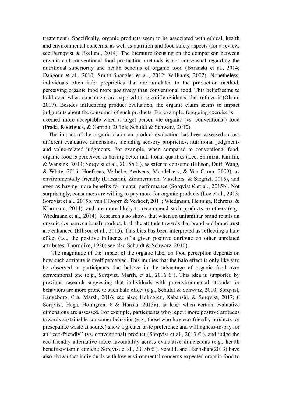 有机声称对产品评价的影响已经通过不同的评价维度进行了评估,包括感知、营养和价值相关判断。例如,与传统食品相比,有机食品被认为具有更好的营养品质(Lee、Shimizu、Kniffin和Wansink,2013年;Sorqvist等人,2015),更安全的消费(Ellison、Duff、Wang和White,2016年;Hoefkens、Verbeke、Aertsens、Mondelaers和van Camp,2009年),并且对环境友好(Lazzarini、ZimmermAnn、Visschers和Siegrist,2016),甚至对精神表现有更多益处(Sorqvist等,2015b)。不足为奇,消费者愿意为有机产品支付更多的费用(Lee等人,2013年;Sorqvist等人,2015年;Doornamp;amp;Verhoef,2011年;Wiedmann、Hennigs、Behrens和Klarmann,2014年),并且更有可能向其他人推荐此类产品(例如,Wiedmann等人,2014年)。研究还表明,当一个不熟悉的品牌零售一种有机(与传统)产品时,对该品牌的态度和品牌信任都会得到增强(Ellison等人,2016年)。这种偏差被解释为反映光环效应(即正属性对其他不相关属性的正影响;Thorndike,1920;见Schuldtamp;amp;Schwarz,2010)。