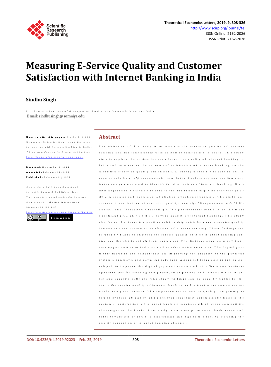 根据[10]的报告,13%的消费者支付由数字支付(包括网上银行)提供。印度目前正处于非货币化阶段,印度政府正在增加其无现金交易。在目前的情况下,印度银行客户被迫更多地使用数字支付系统。越来越多的数字支付系统正在进入印度经济。因此,为了保持竞争力,印度银行必须提高其网上银行系统的质量,以便更多用户使用此渠道进行数字交易。印度的互联网银行业务在城市地区比在农村地区更为发达。目前,44%的客户使用网上银行,这是数字支付的首选模式之一[11]。增加对网上银行的使用将提高客户对这个新交付渠道质量的期望和看法。在这方面,了解如何衡量印度的网上银行服务质量以及客户对此的满意度至关重要。了解客户如何看待服务质量对于了解客户在线交易中的价值至关重要。同时,吸引新客户和留住现有客户也很重要。文献中对印度农村和城市人口的网络银行服务质量维度的测量研究有限。本研究旨在确定电子服务质量维度,并确定其对客户对网上银行满意度的影响。电子服务质量会影响顾客对网上银行的满意程度,而顾客对网上银行的满意程度,对网上银行能否继续使用,将会有重要的影响。本研究的重要理论贡献是通过在网上银行服务质量中加入先前的文献来确定服务质量维度及其与印度银行业客户满意度的关系。本研究的实际贡献将有助于银行提高网上银行服务的服务质量,从而提高银行对网上银行服务的满意度和持续使用。通过本研究确定的质量属性可以用来改进其银行的网络银行产品。