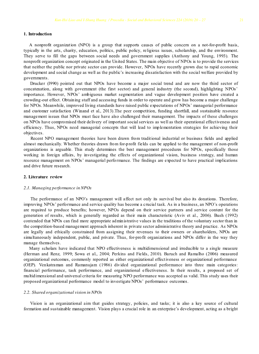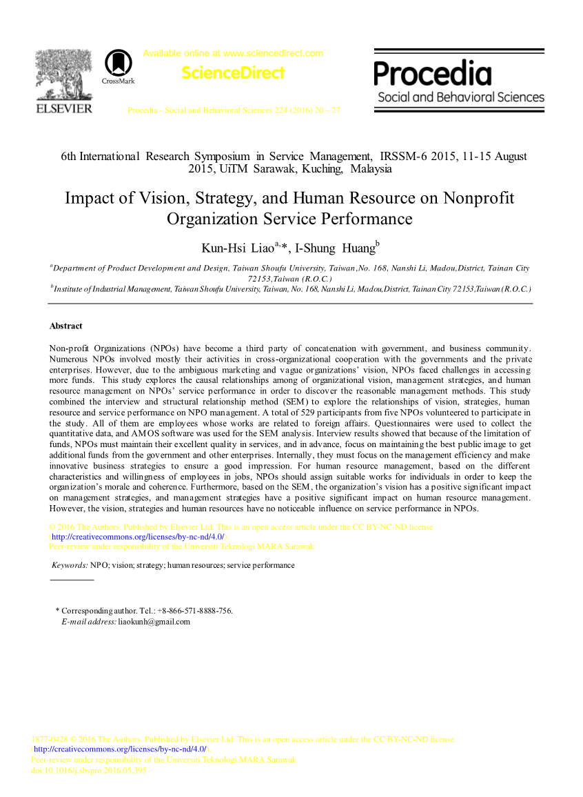 如今的非营利组织管理理论是从传统的工业或商业领域汲取的,几乎是机械地应用。从营利领域汲取的理论能否应用于非营利组织的管理是有争议的。本研究通过调查组织愿景、商业策略和人力资源管理对非营利组织管理绩效的影响,来确定对非营利组织(尤其是从事涉外事务的非营利组织)最佳的管理程序。这些发现将具有实际意义并推动未来的研究。