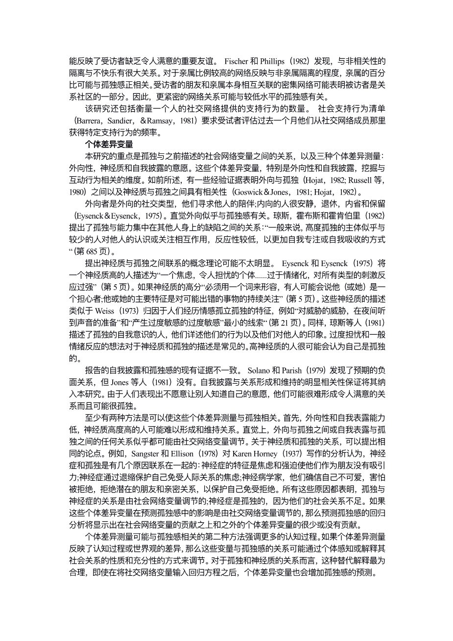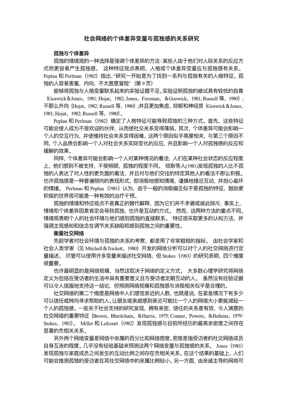 A second dimension of social networks is the number of people in the network one feels close to—that is, how many one can confide in or turn to for help in an emergency. Having friends or relative one feels close to is probably more important in alleviating loneliness than the size of one's network. Several studies of social support have found that having close, confiding relationships is an important feature of effective, satisfying social networks (Brown, Bhrolchain, amp; Harris,1975; Conner, Powers, amp; Bultena, 1979:Stokes, 1983). Miller and Lefcourt (1982)found a strong negative relation between loneliness and a measure of the maximum level of intimacy currently experienced.