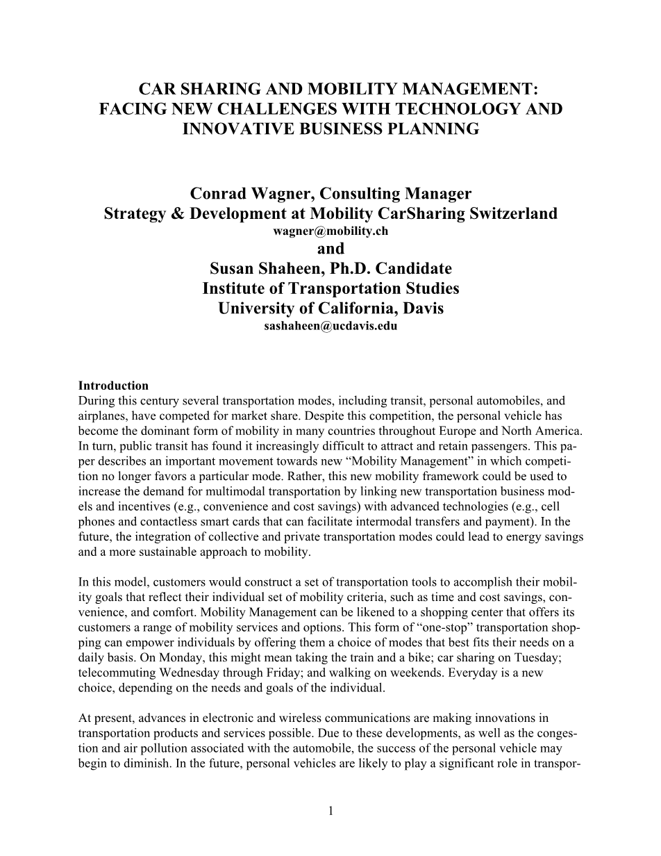 运输产品和服务。由于这些发展,以及拥堵与汽车有关的空气污染,个人汽车的发展成功性可能开始减少。在未来,个人车辆可能会在交通运输中扮演重要的角色。然而,它们的重要性可能会发生变化。与它们目前的“主导地位”模式形成对比,汽车可能被视为广泛的有吸引力的移动方式中的一个选择。就像规划者过去在城市里投资个人汽车一样,交通规划者和政策制定者现在有机会通过采用先进的技术,“重新设计”交通,使之成为一套多样化的移动服务。汽车共享是这个过程中重要的一步。在过去的十年里,汽车共享在欧洲经历了一个成功的开拓阶段。目前,汽车共享已经开始向专业和盈利的业务框架转变,其中包括在整个欧洲的一些地区移动服务。汽车共享是广泛的移动服务环境中的一种服务,例如汽车租赁和