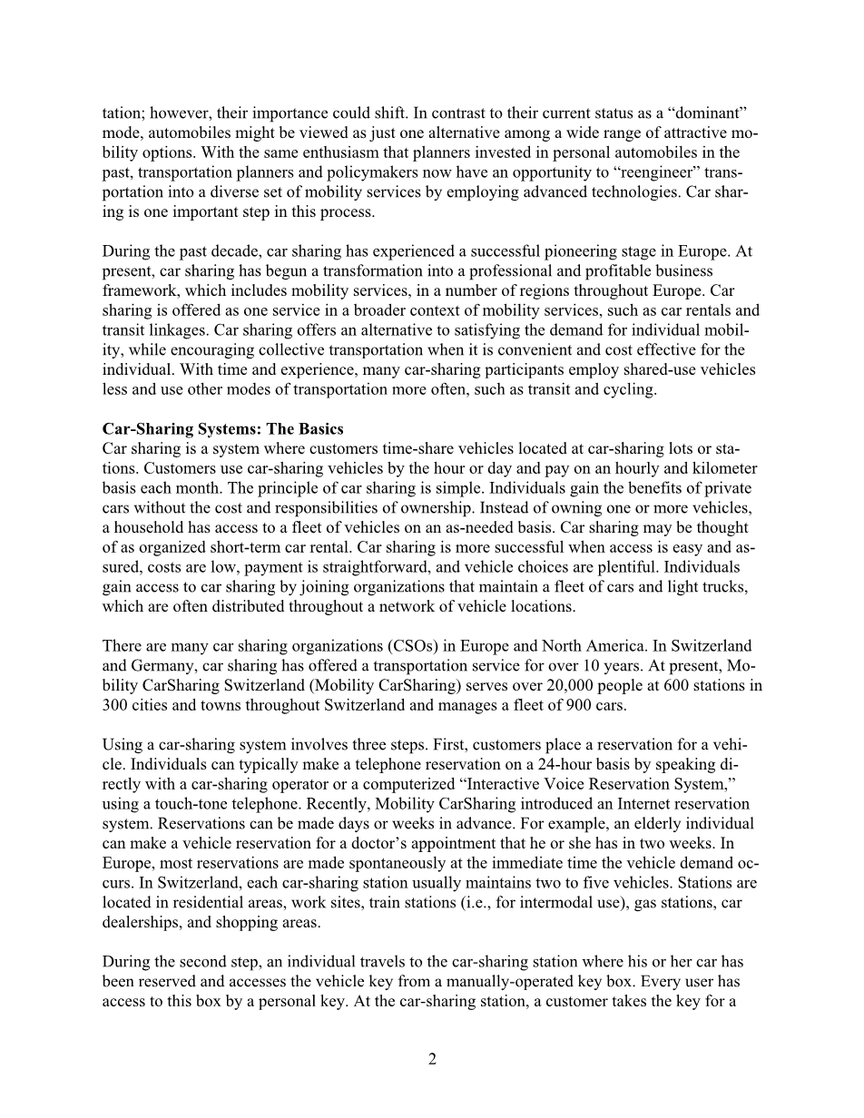 1987年,瑞士开始实行汽车共享。基于1997年现有公司的合并,移动汽车共享瑞士成为一个全国性的汽车共享公司。汽车共享公司提供的统一的标准和优质服务帮助了这个组织在过去的十年里有显著的增长。目前,该组织持有近50%的股份占欧洲所有汽车共享用户的市场份额,目前正在扩大其市场份额。基于伙伴关系管理的原则,移动汽车共享服务目前拥有2万名客户,预计明年将以100%的速度增长。伙伴关系管理原则是一个商业框架,在这个框架中,汽车共享供应商与其他企业合作,比如交通运营商、加油站和汽车租赁公司,提供综合移动服务增强其产品和服务的竞争力。由于不同的标准和操作,德国公民社会组织经历了缓慢的增长。相比之下,许多德国公民社会组织仍处于创业阶段,强调草根组织,本地策略和操作。由于相对较高的月费和定期的会员流失,德国的平均增长率只有每年10到20的百分比。目前, 在德国大约有25,000名汽车共享参与者。然而,由于最近两家伞组织(即。德国的欧洲汽车共享组织(欧洲汽车共享德国)和BOA (Bund organisierter Autoteiler)汽车共享公司的合并,以及Stattauto的柏林和Stattauto汉堡努力“标准化”CSO操作和服务,它的市场份额可能很快就会增加。提供专业汽车共享服务的其他欧洲国家是荷兰和奥地利。此外,新的汽车共享业务很快将在瑞典、丹麦、意大利、还有英国展开。此外,还有一些有趣而先进的汽车共享的发展行动都在美国发生。这些行动中有许多要么是研究,要么是考虑先进的汽车共享技术和服务。1998年2月,在波特兰拼车开始提供服务。1998年秋天,西雅图市计划推出一项大型汽车共享计划。今年秋天晚些时候,加州大学交通运输研究所,戴维斯(与它的合作伙伴:旧金山湾区快速交通区(BART);美国本田汽车公司;劳伦斯利弗莫尔国家实验室(LLNL);Teletrac有限公司;INVERS)将启动“CarLink:智能汽车共享系统”计划。这个示范项目的目的是实施和评估一个智能汽车共享计划,强调先进技术。本田Civics,一款智能的压缩天然Hond机,汽车共享管理系统,和一个自动车辆定位单元),多个汽车共享站,和可靠性。此外,还有其他几个美国人一些城市提出了汽车共享项目,主要是人口在50万以上的城市。