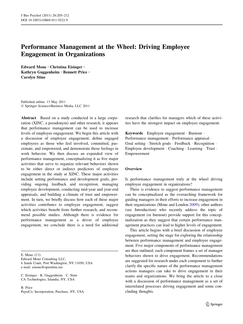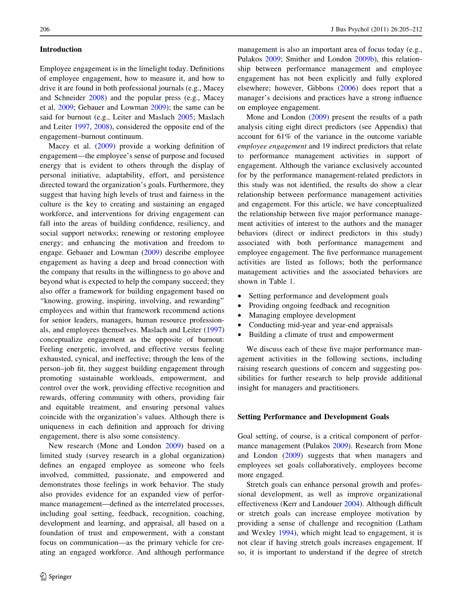 Mone and London present the results of a path analysis citing eight direct predictors (see Appendix) that account for 61% of the variance in the outcome variable employee engagement and 19 indirect predictors that relate to performance management activities in support of engagement. Although the variance exclusively accounted for by the performance management-related predictors in this study was not identified, the results do show a clear relationship between performance management activities and engagement. For this article, we have conceptualized the relationship between five major performance management activities of interest to the authors and the manager behaviors (direct or indirect predictors in this study) associated with both performance management and employee engagement. The five performance management activities are listed as follows; both the performance management activities and the associated behaviors are shown in Table 1.