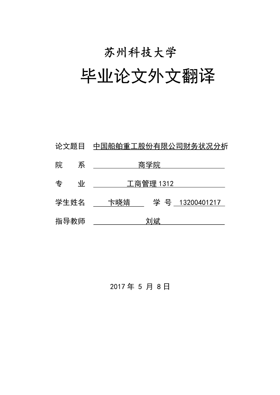 中国船舶重工股份有限公司财务状况分析外文翻译资料 2022-03-23 20:47:39 英语原文共 5 页,剩余内容已隐藏,支付完成后下载完整资料 英语译文共 4 页,剩余内容已隐藏,支付完成后下载完整资料资料编号:[485814],资料为PDF文档或Word文档,PDF文档可免费转换为Word 原文和译文剩余内容已隐藏,您需要先支付 30元 才能查看原文和译文全部内容!立即支付 发小红书推广免费获取该资料资格。点击链接进入获取推广文案即可: Ai一键组稿 | 降AI率 | 降重复率 | 论文一键排版 PREVIOUS NEXT 您可能感兴趣的文章 精益管理-精益管理方法在酒店业中的应用外文翻译资料 主题公园外文翻译资料 财务报表的可持续发展和重新概念化外文翻译资料 关于被选择公司的财务分析外文翻译资料 葡萄酒和文化遗产:阿尔托杜罗河葡萄酒产区的经验外文翻译资料 创意经济、文化产业与地方发展外文翻译资料 我国商业银行个人理财业务的战略研究与发展现状外文翻译资料 大学生的信用卡消费外文翻译资料 成功的学前儿童语音意识教学:课堂经验外文翻译资料 剑桥中国文学史外文翻译资料