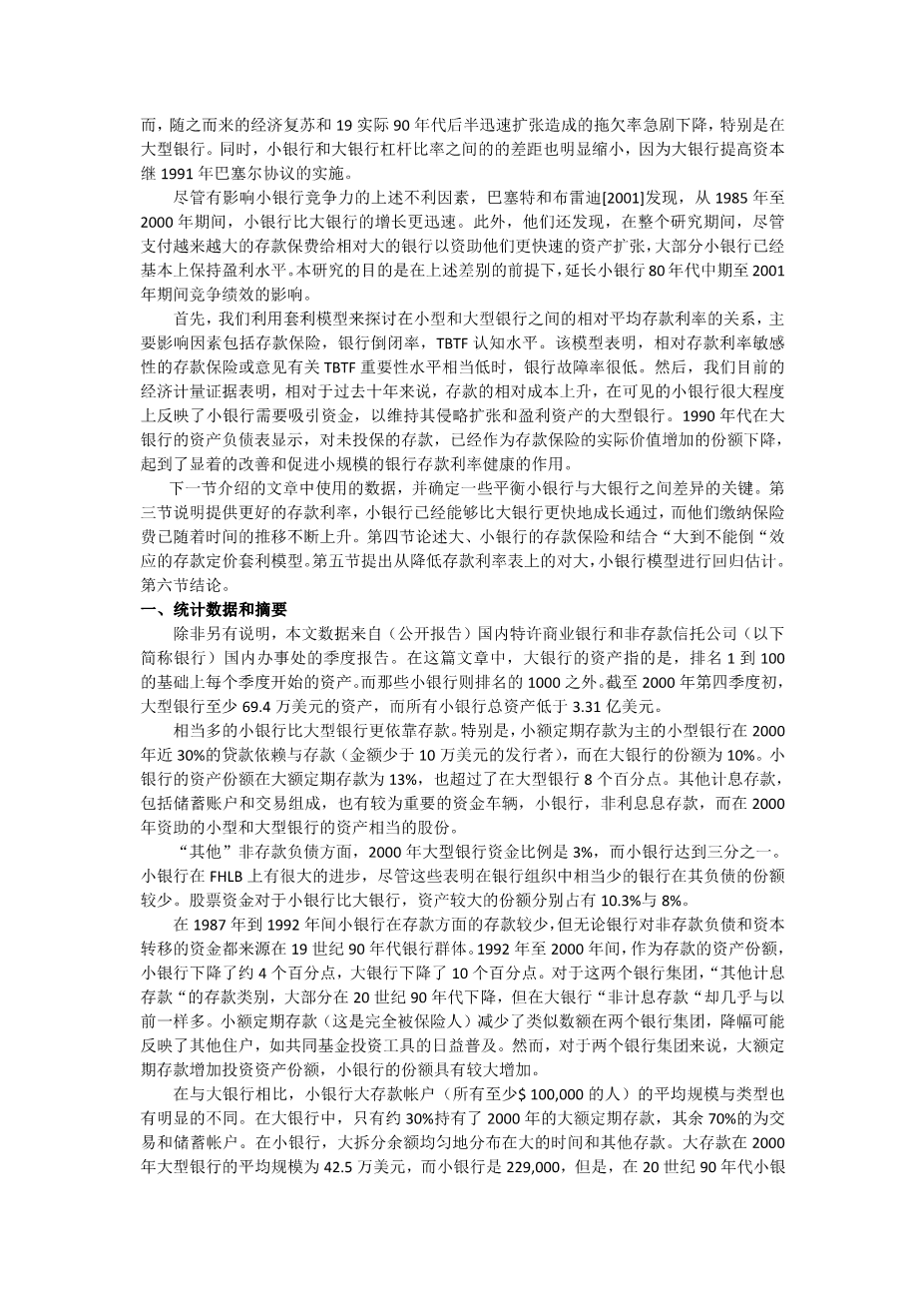 small banks in recent years including consolidation and improved financial strength of large banks, competition from nonbank financial firms, and a decline in the real value of deposit insurance.  Despite those challenges, small banks have grown more rapidly than larger banks over the period from 1985 to 2001, and their profitability has been sustained at high levels.  However, small banks have needed to increase the interest rates offered on deposit accounts in order to attract progressively more deposit funding. In this paper, we provide empirical evidence that this increased interest cost primarily reflects the higher rate of return that small banks were able to earn on their assets.  Moreover, we show with an arbitrage model that the decline in the real value of deposit insurance has only a small effect on deposit rates as long as bank failure rates are in the low range of recent years.