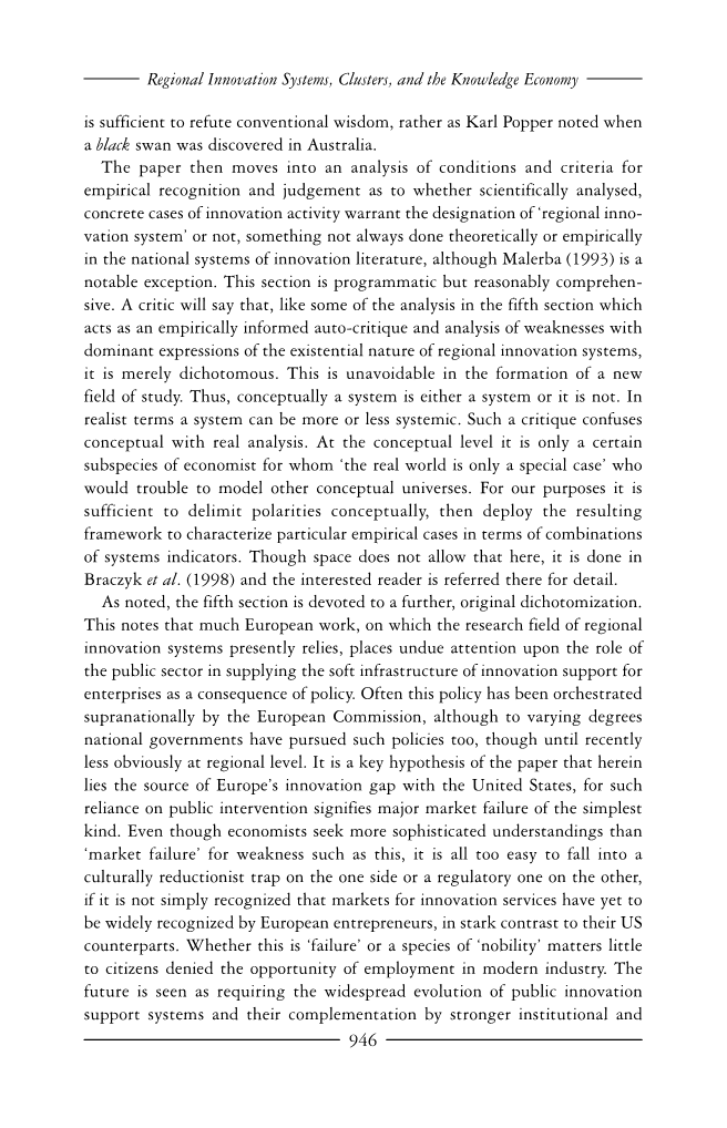 然后,本文转向对经验认识和判断的条件和标准进行分析,以确定是否进行了科学分析,创新活动的具体案例是否需要指定“区域创新体系”,但这在理论上或经验上并不都是如此,尽管马勒巴(1993)是一个典型的例外。本部分的分析具备了程序性的与合理性。就像第五部分的一些分析一样,它是对区域创新系统的存在主义表现形式缺陷的一种经验性的自我批评与分析。评论家批评说这只是二分法,在形成一个新的研究领域中是不可避免的。因此,从概念上讲,系统的概念既对又不对;从实际上讲,一个系统可能或多或少是具备系统性的。然而这种批评会将概念分析和实际分析混淆。就概念层面而言,只有经济学家的某些亚种“真实的世界只是一个特例”,他们很难模拟其他的概念宇宙。就我们的目的而言,从概念上划分极性就足够了,然后根据系统指标的组合部署最终的框架来描述特定的经验案例。本篇文章相关内容有限,有兴趣的读者可以参考布拉克齐克等(1998)里的细节。