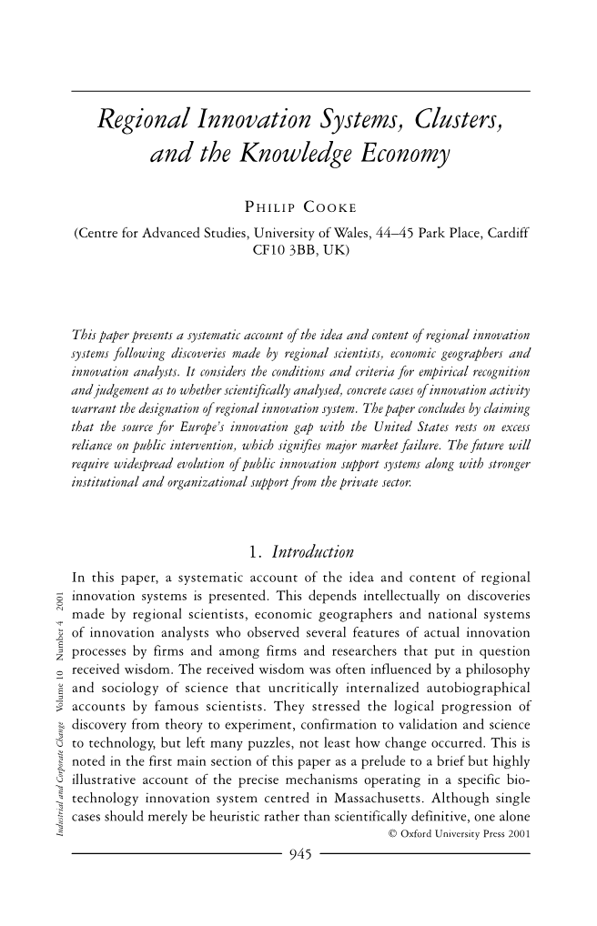 因为创新系统分析师一直执着于 “国家”经济体,RIS的概念是一个相对较新的概念。它的研究可以追溯到库克(1992)发表的论文和第一个在论文中收集的文章(布拉克齐克等人, 1998; 库克, 1998)。这一概念的发展路径几乎完全来自区域科学和经济地理学。事实上,像伦德沃尔(1992)这样的作者对这个概念怀有奇怪的敌意,坚持 “国民经济”理念,并且这种观念现在似乎越来越受到质疑。在英国,关于技术变革和区域发展的研究已经有了很长的历史,例如,奥基(1979年)和美国的里斯(1979年),尽管关于这一主题的最早的论文之一是托马斯(1975)。奇怪的是,托马斯,里斯和库克是来自威尔士的。从现在的作者的研究中可以肯定的是,里斯就像世界上许多地区的科学家一样,在已故的摩根的研究中受到了影响。而托马斯的研究,在佩鲁(1955年)之后,对生长极的研究做出了重大贡献。由此,与创新研究的联系得以体现。正如库克(2002)所指出的,在安德森(1994)之后,佩鲁在阅读了熊彼特(1975)的”关于破坏性经济变化的研究和激进创新对增长过程的影响”之后,发展了增长极的概念。佩鲁的贡献是强调了达门(1950)所提出的“开发区”的经济区域,也就是现在人们所熟知的波特(1998)的产业集群。