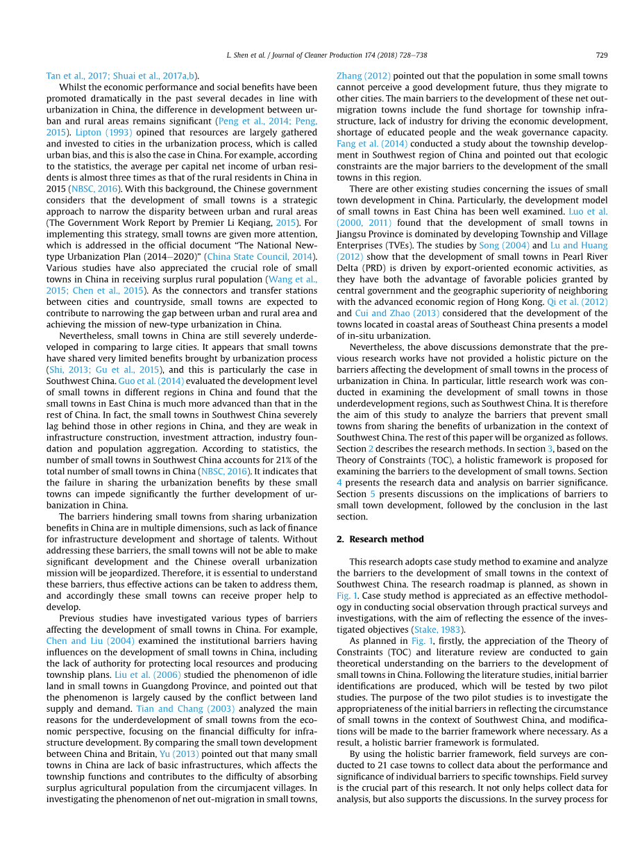 以前的研究已经调查了各种影响中国小城镇发展的障碍。例如,陈和刘(2004)检查制度壁垒对中国小城镇发展的影响,包括保护当地资源和生产乡镇计划缺乏权威的问题。刘等人(2006)研究了广东省小城镇闲置土地现象,指出这种现象主要是由土地供需矛盾引起的。田和常(2003)从经济角度分析了小城镇发展不充分的主要原因,重点在于基础设施发展存在财政困难。通过对中国和英国之间小城镇发展进行比较,于(2013)指出,在中国,许多小城镇的基础设施缺乏直接影响了乡镇职能,加重了从周边村庄吸纳剩余农业人口的困难。调查小城镇网外迁移现象,张(2012)指出,一些小城镇的人口由于无法预见到一个良好的发展前景,于是他们选择移居到其他城市。对导致这些迁出城镇发展的主要障碍包括乡镇基础设施建设资金短缺,缺乏推动经济发展的行业,受教育人口不足和治理能力欠缺。方等人(2014)在中国西南地区进行的的乡镇发展研究会上指出生态约束成为这个地区的小城镇发展的主要障碍。