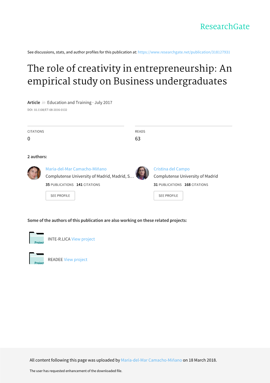 欧盟委员会发布了一份名为EntreComp的报告,内容涉及“解决欧洲当前面临的技能挑战”的创业能力框架。一份关于就业能力和竞争力的报告强调企业家精神和创造力是企业家的基本特征(Bacigalupo et al,2016)。这种创新精神与独创性密切相关,并且它们都与创造力有关,但只有少数大学为这些技能培养新的专业人才。事实上,目前关于大学在知识型经济中的作用存在着狭隘的观点(Van Der Steen and Enders,2008)。然而,许多大学生可能会拒绝这个成为企业家的问题,因为他们可能会觉得他们不具备创造力。考虑到所有这些因素,本科生的创业积极性可能会缓解青年失业问题,同时创造新的企业和就业机会。因此,本文的目的是通过分析一组本科生样本的企业家课程和创造力水平,重点讨论他们创业的意图和影响其创业意图的因素。这些意图可能转化为随后的潜在创业行为(Kuckertz and Wagner,2010)。我们假设参加创业课程的学生与那些认为不需要根据Goldsmith and Kerr (1991)开创新商业理念的学生之间的创造力水平存在显着差异。此外,我们还会探究以前研究成果中发现的其他因素,如性别或父母的自我就业状况。所用的方法基于非参数测试。