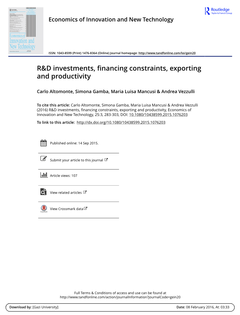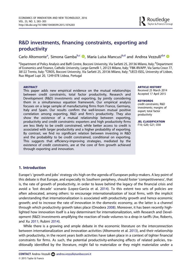 本文通过综合考虑,通过在联立方程框架内共同考虑,为信贷约束、全要素生产率、研究与开发(Ramp;D)投资与出口之间的相互关系提供了新的实证证据。我们的实证分析集中在来自法国、德国、意大利和西班牙的大量制造业公司。我们的结果证实了出口、研发和公司生产率之间众所周知的相互正相关关系。 它们还表明出口、生产力和信贷约束之间存在着相互关系:出口商和高生产率企业不太可能受到信贷约束,然而更好地获得信贷与更高的生产率和更高的出口概率有关。相比之下,我们发现在研发投资和信贷约束的可能性之间没有显著的关系,条件是出口。这表明,提高效率的策略,其由于信贷约束的存在,是企业通过出口和创新实现增长的核心。